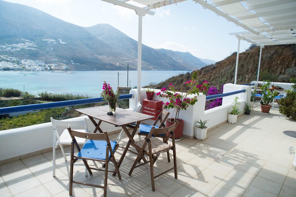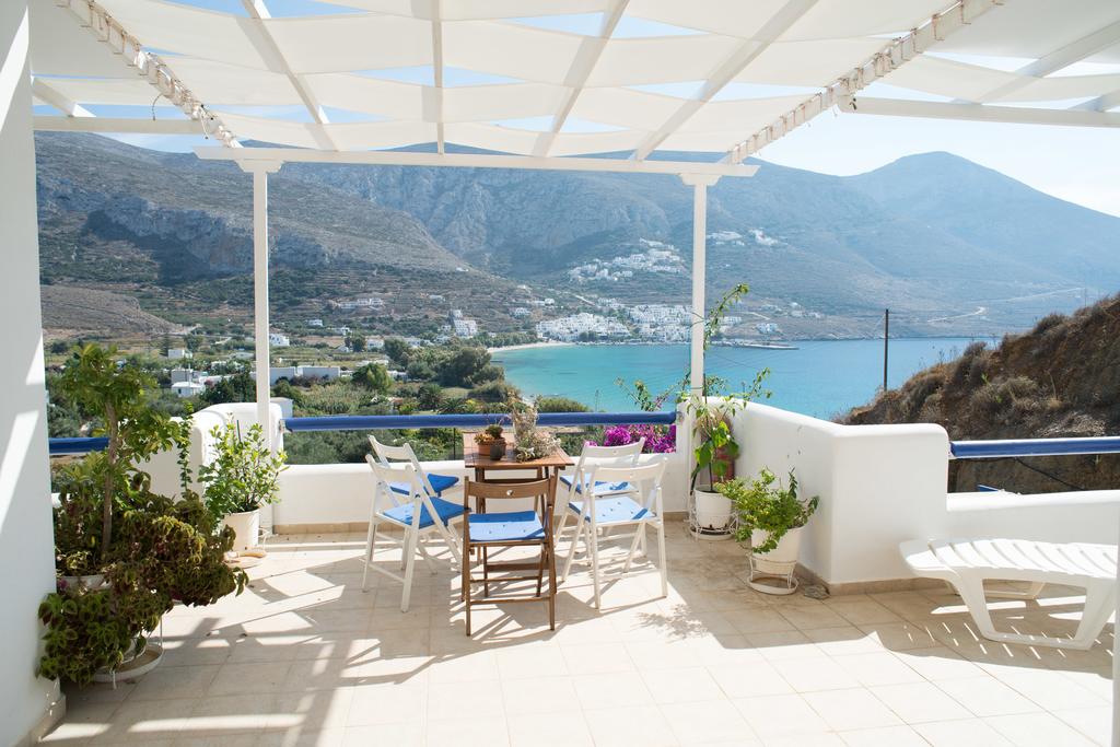 Amorgi Studios is situated in a serene and picturesque area on the Aegiali beach in Amorgos, offering peace of mind together with convenient access to the village, the stunning beaches nearby, and the constantly bustling Aegiali. Every spacious studio and apartment opens to a furnished patio or balcony that provides shelter and views of Aegiali Beach. They have a kitchenette or kitchen with a little oven with cooking hobs, fridge, and coffee machine, and they are decorated in pastel colors. There's satellite TV and air conditioning. The reception desk can assist you about your stay and Amorgos island, services such as boat rentals, activities such as diving, hiking, fishing and different cruises.
