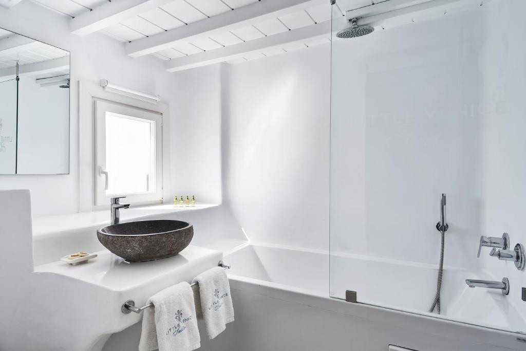 Little Venice is constructed with consideration for the regional architectural style, each white-painted suite features built-in beds, hardwood ceilings, and Coco-Mat bedding. Free WiFi, an iPod dock, and a smart TV with satellite channels are among the amenities. Free toiletries, slippers, and bathrobes are provided. Additionally, some apartments have an outdoor hot tub or spa.