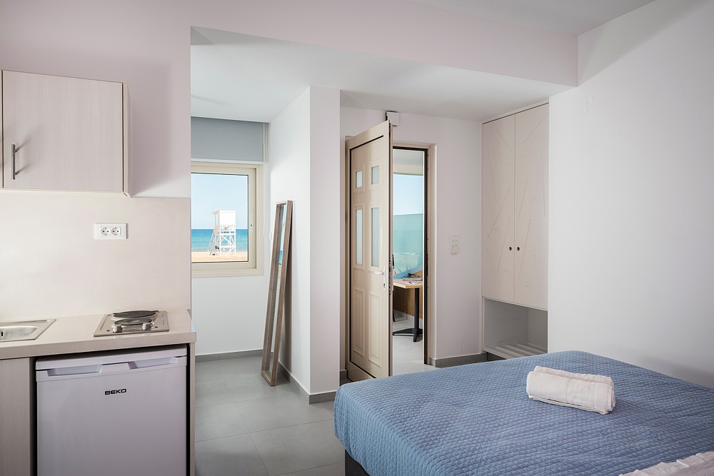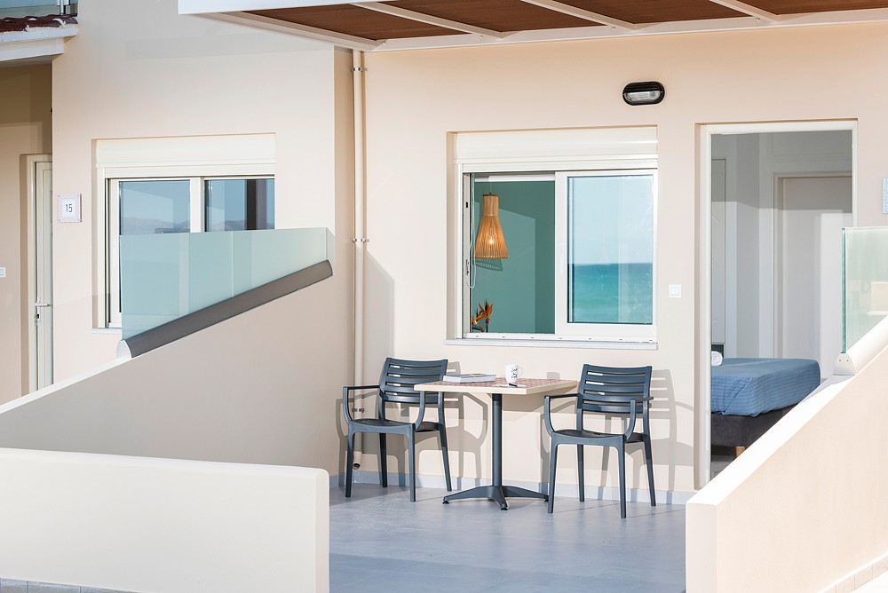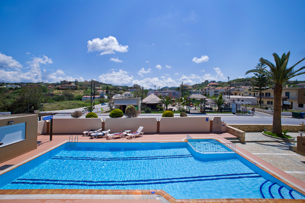 The Marine Claire Studios and Apartments are situated on one of Chania's most well-known sandy beaches, Stalos Beach, in Kato Stalos, Crete. The hotel is located about 7 kilometers from Chania's city center. With several improvements throughout the years, the hotel has been open since 1989. There are 19 total rooms available, 4 of which are flats with private bedrooms and 15 of which are studios. Seventeen of the hotel's 19 rooms provide views of the sea. The studios at the accommodation come with air condition, furnished balconies, safebox, kitchenette, kettle, TV and bathroom with toiletries. The staff at Marine Claire Apartments will assist you on any information about Chania and generally the island of Crete. There is a swimming poolto relax and soak up Greek summer. The area of Stalos where Marine Claire hotel is situated has many restaurants, a mini market, a pharmacy, an ATM and a very nice mini golf - café. The distance to the Souda port is 12 km, while the airport is 23 km away. It takes around thirty minutes to go from the airport to the hotel via taxi. A bus to the city center is also available. The hotel entrance is directly outside the bus stop that travels to and from Chania's city center. Book Now! and compare rates offered by various online booking services.