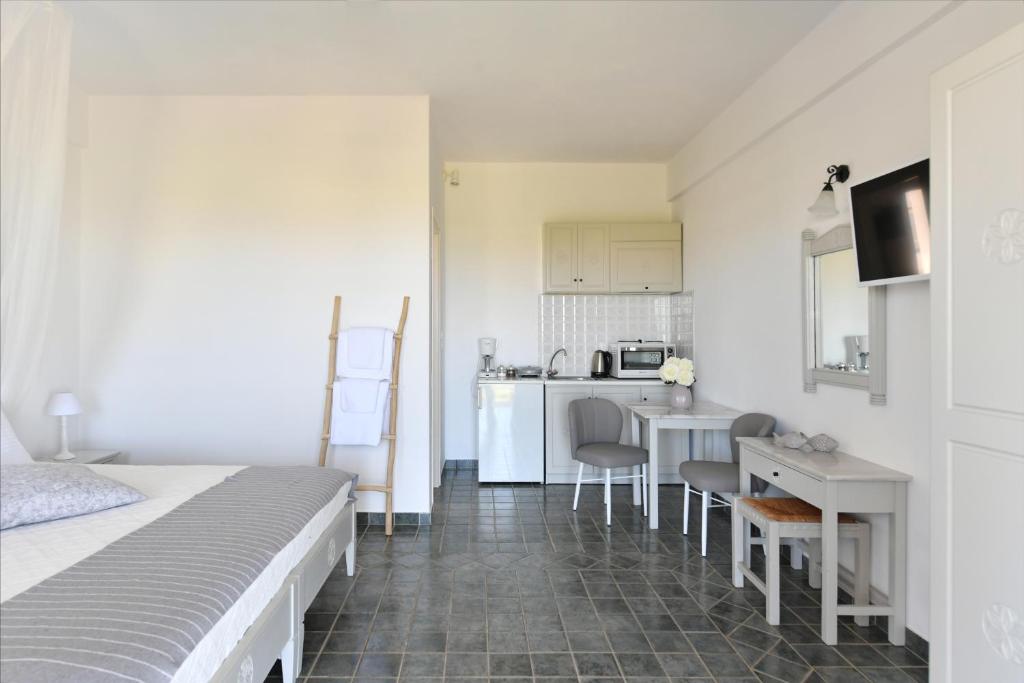 It has ten luxurious apartments, which may accommodate from 2 to 4 persons. The beautifully decorated and spacious units are a guarantee for a pleasant stay. They provide you with a great view of the bay of Naoussa and have large verandas with bamboo furnishings. The apartments feature air conditioning, satellite TV, telephones, and fully furnished kitchens (refrigerator, toaster, coffee maker, kettle, oven, dishes, glasses, and silverware) and bathrooms (bathtub, hair dryer, and amenities). Dive in the swimming pool and soak up the sun or enjoy a refreshing beverage at the coffee shop.