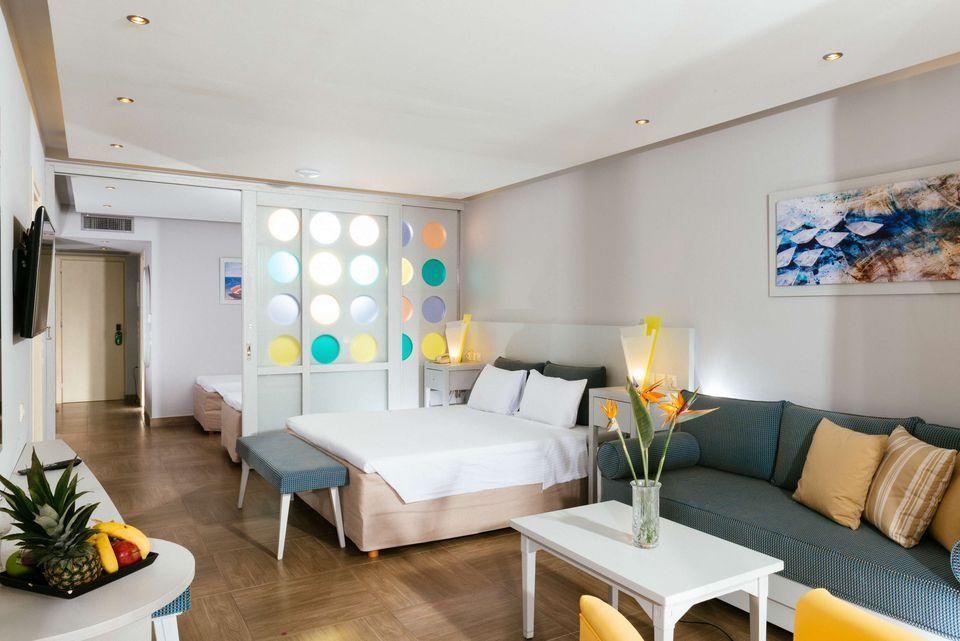 The rooms feature sea- or garden-view double rooms, family rooms, and suites with or without a swimming pool, all equipped with free Wi-Fi, mini fridge, sat/TV, air condition, telephone and coffee facilities.