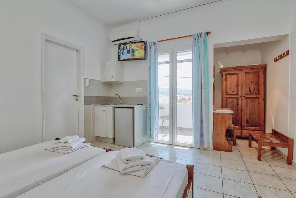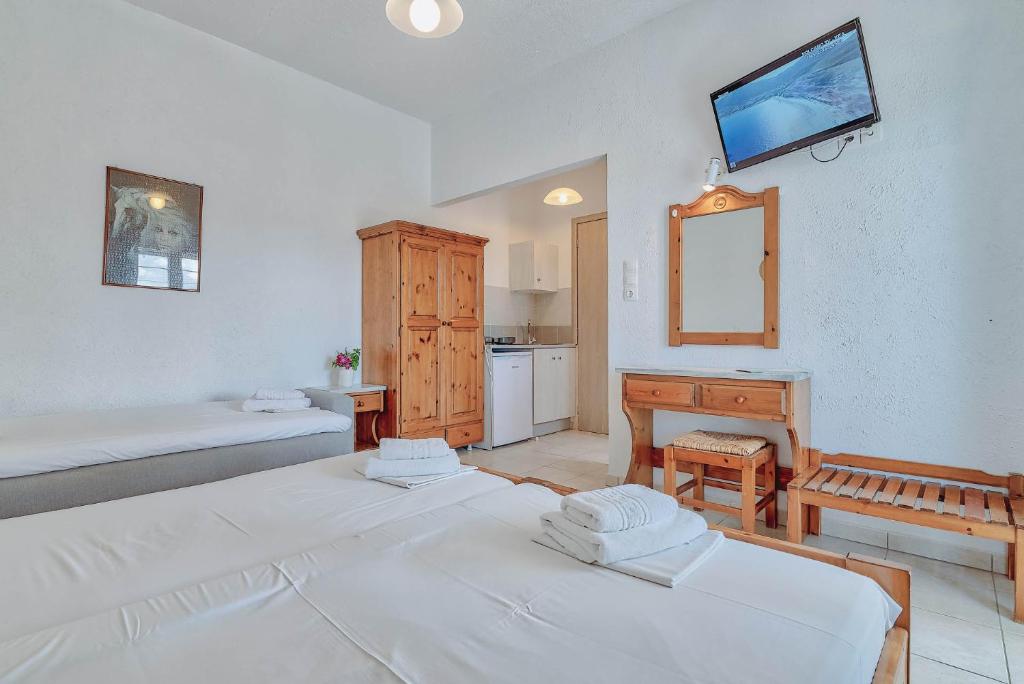 On the Greek island of Antiparos in the Cyclades, Pavlos Place is a neat welcoming, family-run hotel with double, triple, and two-bedroom apartments that can accommodate up to five guests. Additionally, it is a typical Greek restaurant with a wide range of Greek tastes and other foods that are unique to the island, all of which are prepared and served by the family in a welcoming environment. The owners of Pavlos Place will give you a warm welcome as if you were a part of their own family and would be happy to assist you in planning the vacation of your dreams in Antiparos. Pavlos’ rooms follow the local style featuring blue and white colours. They come with a flat-screen TV, mini fridge and electric kettle and they all have an en-suite bathroom with free toiletries.