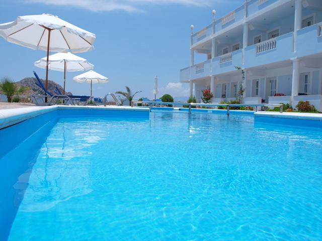 The Athena Pallace Hotel is situated in one of the nicest spots on the island, next to the historic Arkesia Acropolis. A collection of recently constructed lodging units is located adjacent to the sandy and pebbly beach on Arkassa, Karpathos Island. This Karpathos hotel has two stories with spacious apartments that can accommodate four to five people, all centered around an amazing swimming pool. There are fourteen completely furnished apartments with separate balconies that overlook the open sea and the swimming pool available for your use. The apartments have a living space with a sofa bed, a fully functional kitchen with a small oven, all the necessary cookware, a kettle, a coffee maker, and a refrigerator. Additionally, each of the apartments has a separate bedroom with a double or single bed, air conditioning, and a private bathroom with a shower.