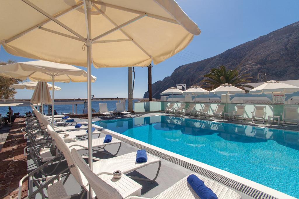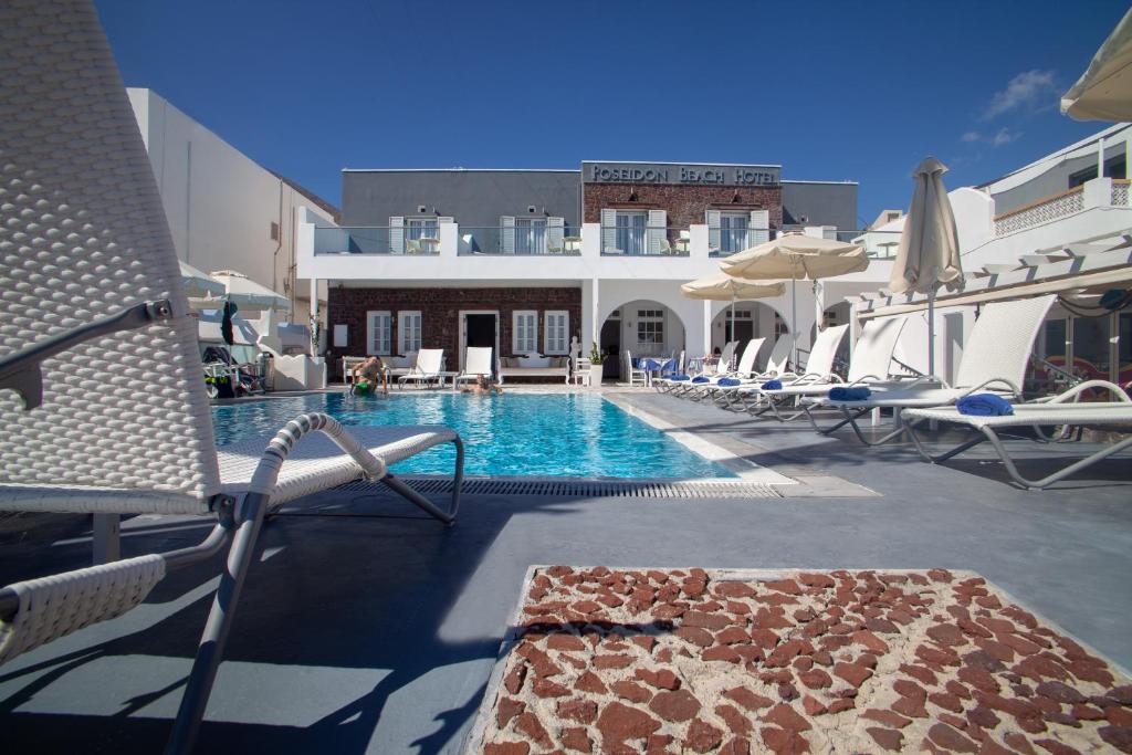 Situated on the well-known and sophisticated Kamari black beach on stunning Santorini Island, the Poseidon Beach Hotel is a typical family-run hotel that features the iconic architecture that has made it so well-known. Poseidon offers accommodations with light décor, basic furniture, and balconies, some of which have views of the sea. The hotel features a restaurant and an outdoor pool. Each unit has a safe, and some of them also have smart TVs.