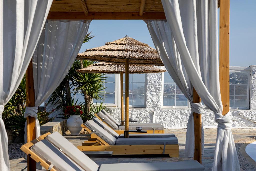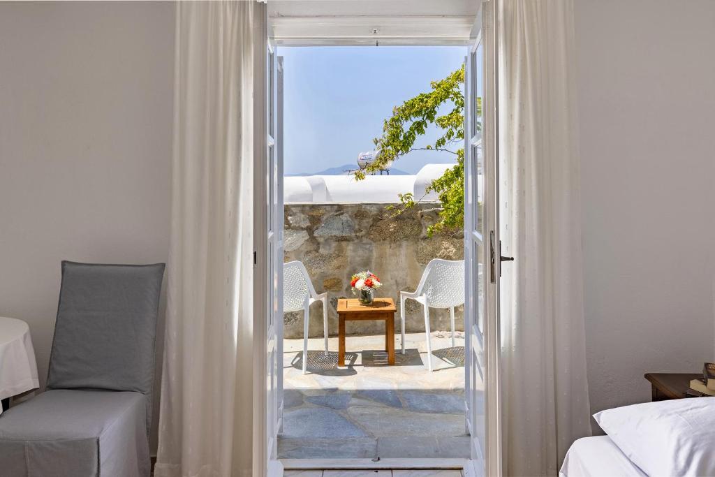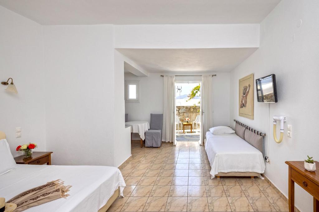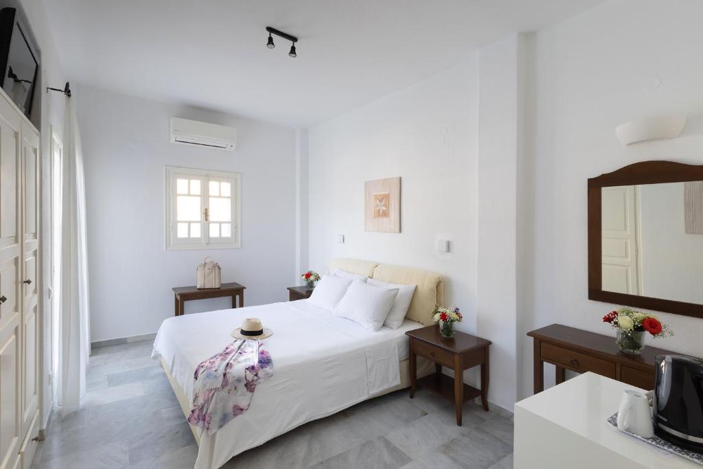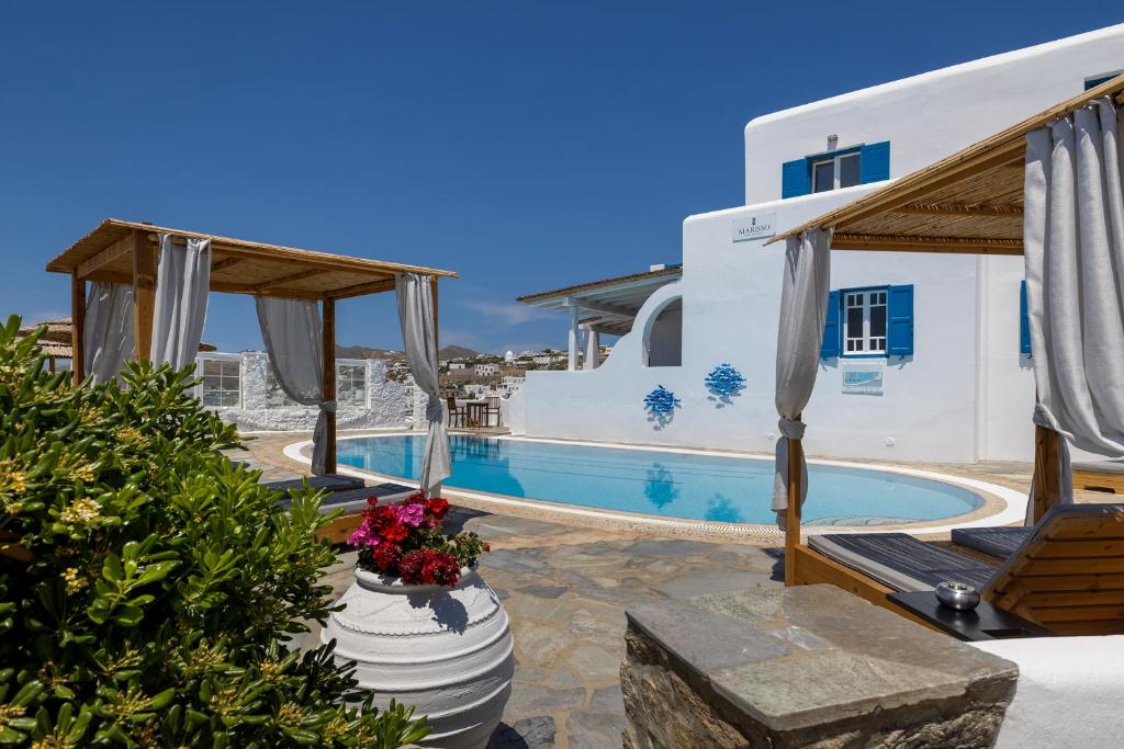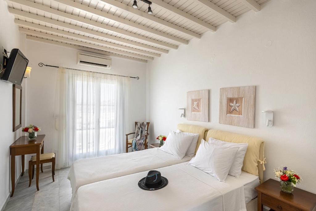 The Marisso Hotel, which has undergone constant renovations, is a tranquil refuge with views of Mykonos Town, the Aegean Sea, and the nearby islands. This Mykonos hotel takes great pleasure in providing individualized attention to each visitors, and will do everything to fulfill your requests and make your stay unforgettable. The air-conditioned rooms of the Marisso Hotel are spacious and light, with elegantly combined modern and classic design features. Every studio and room has tile floors, a fridge, aircondition, safe box and a satellite TV. There is a hair dryer and complimentary amenities in the private bathroom. A small private swimming pool greets you as soon as you arrive at the property, and the breakfast area, lounge, and bar are all next to the terrace.
