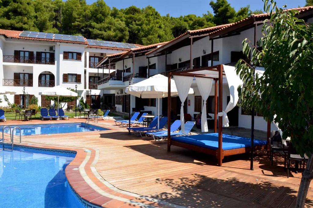 The Delphi hotel is located in the serene and charming Elios Village area in the Neo Klima region on the stunning Greek island of Skopelos. The Delphi Hotel, which is encircled by dense pine forests and only a few meters from the sea, offers a tranquil haven with individualized service and a sizable outdoor pool. The hotel's studios and apartments include private balconies or patios with views of the garden or the sea. Each has a TV, a tiny fridge, and air conditioning. The on-site restaurant serves traditional specialties created using the best local ingredients. There is free Internet access and parking space for your vehicle. The main town and port of Skopelos are 18 km away from Delphi hotel.