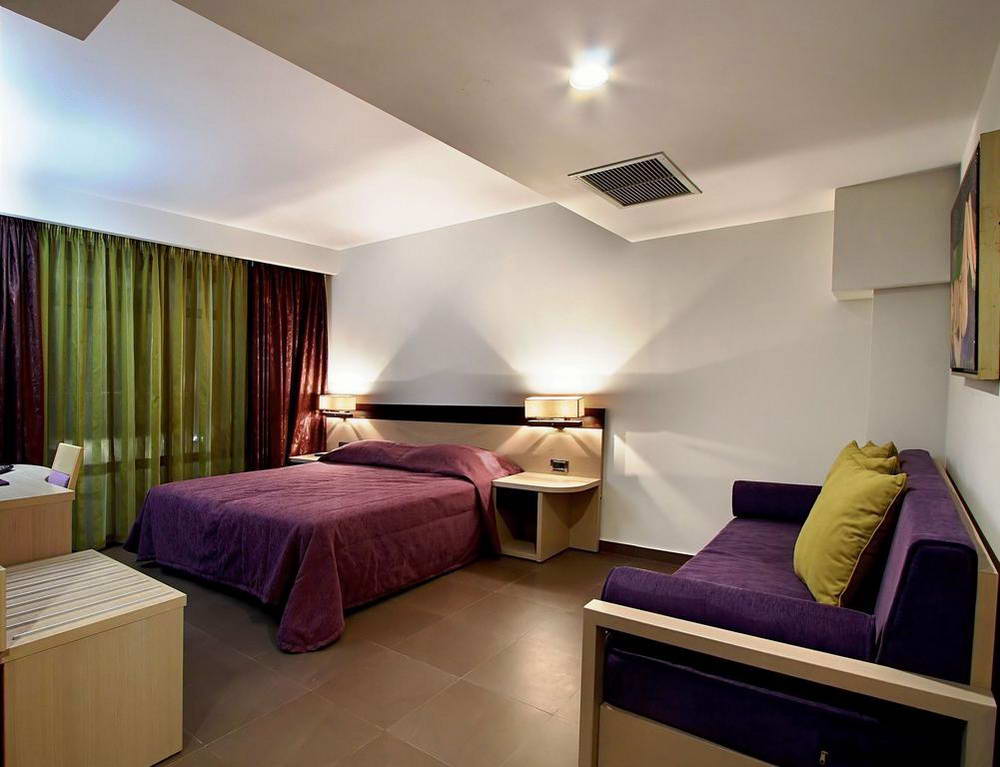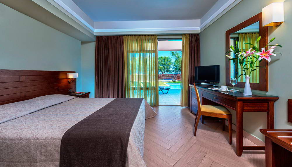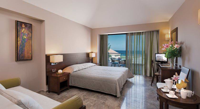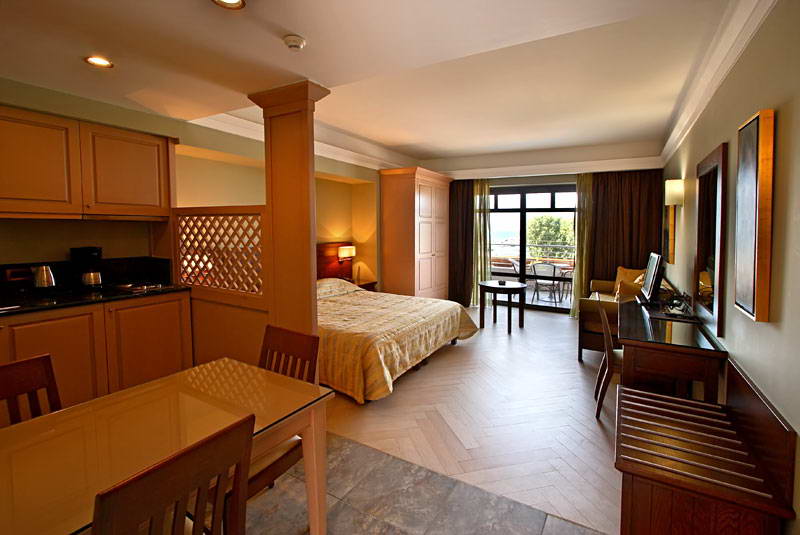 It is consisted double rooms, maisonettes and studios of twin beds, or a double bed, extra persons with a large marble bathroom with bathtub, hair dryer, individually controlled A/C, color Satellite TV, music channels, direct dial telephone, Internet access (ISDN), mini bar (available upon request), safe deposit box and balcony or veranda. Views are pool, garden, side sea view or sea view.