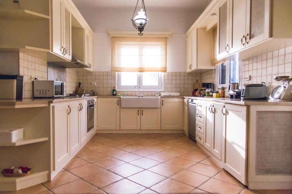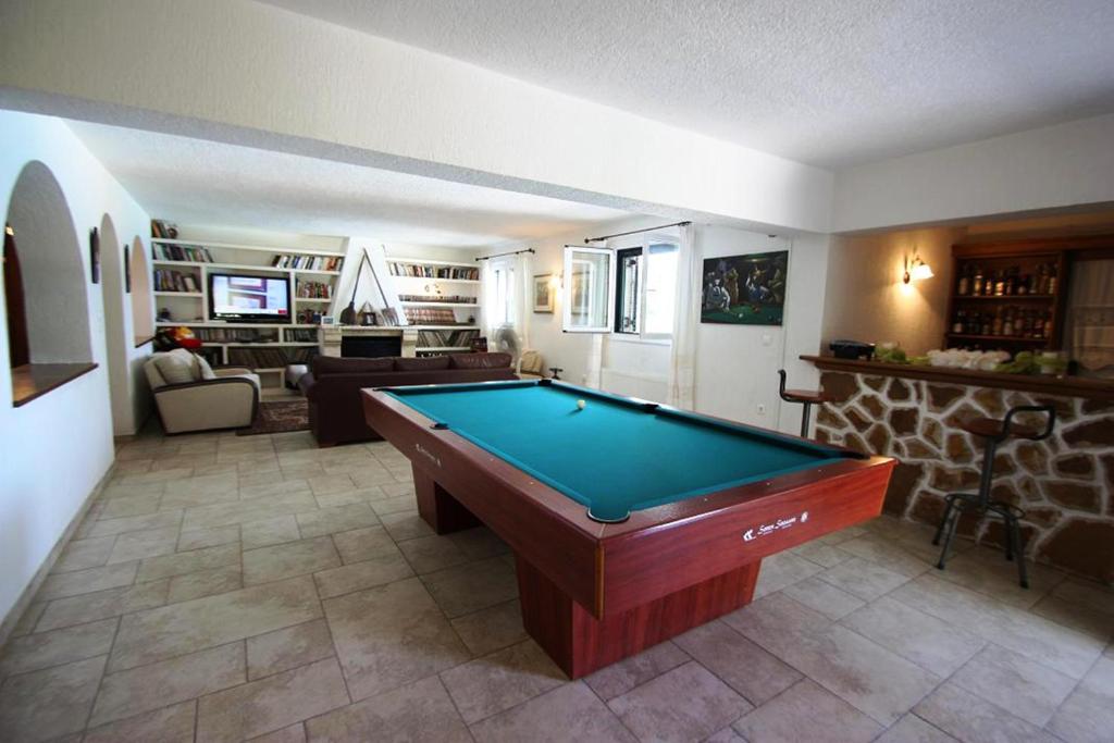 The three-story villa features three bedrooms with en suite bathrooms and double beds, each with a private balcony and a stunning view of the sea; two twin rooms with a shared bathroom; a playroom complete with a full-sized American pool table, bar, and TV area; a large living room that is open to the dining area; and a fully furnished kitchen for aspiring Greek chefs.
