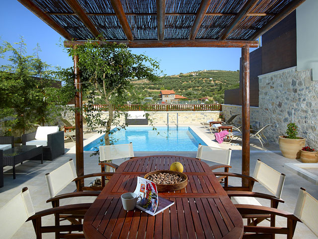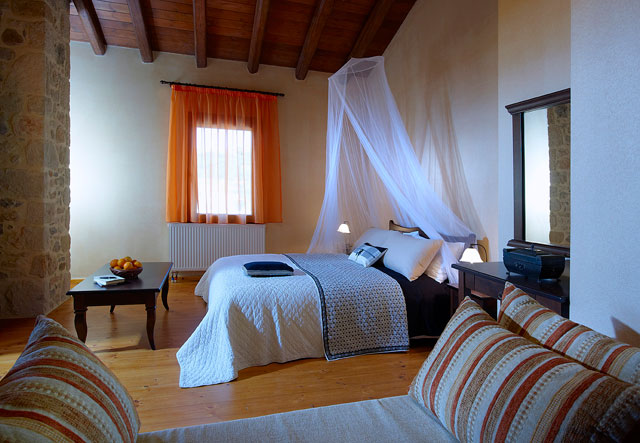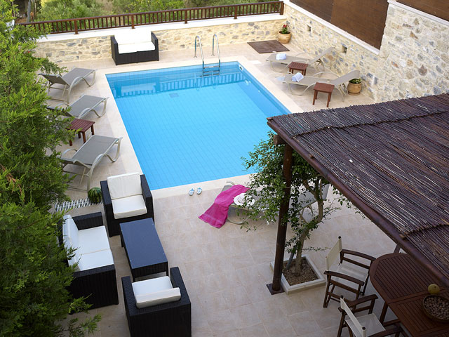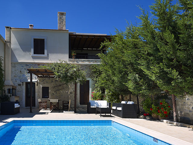 One of the finest accommodations in Crete, the villa "Agreielia" is housed in a restored traditional stone house of two floors (178,93 m2) in the village of Sgourokefali in Heraklion near Archanes. The ground level features a huge living room with an arch separating it from the dining room, a separate, fully equipped kitchen with a fireplace, a wide bedroom with a double bed (15 sq. m.) with an overlook of the eastern courtyard, and a large bathroom with a Jacuzzi. Ground floor living area with fireplace and classic furniture. Surrounded by two courtyards, the villa's bottom floor is a haven of flowers, colors, and scents where visitors can unwind and take in the scenery. An ancient stone stairway and well at the courtyard entry (west terrace) lend the area a certain ambience. There is a grilling area and a swimming pool for your enjoyment. The villa can accommodate from 2 to 6 guests.