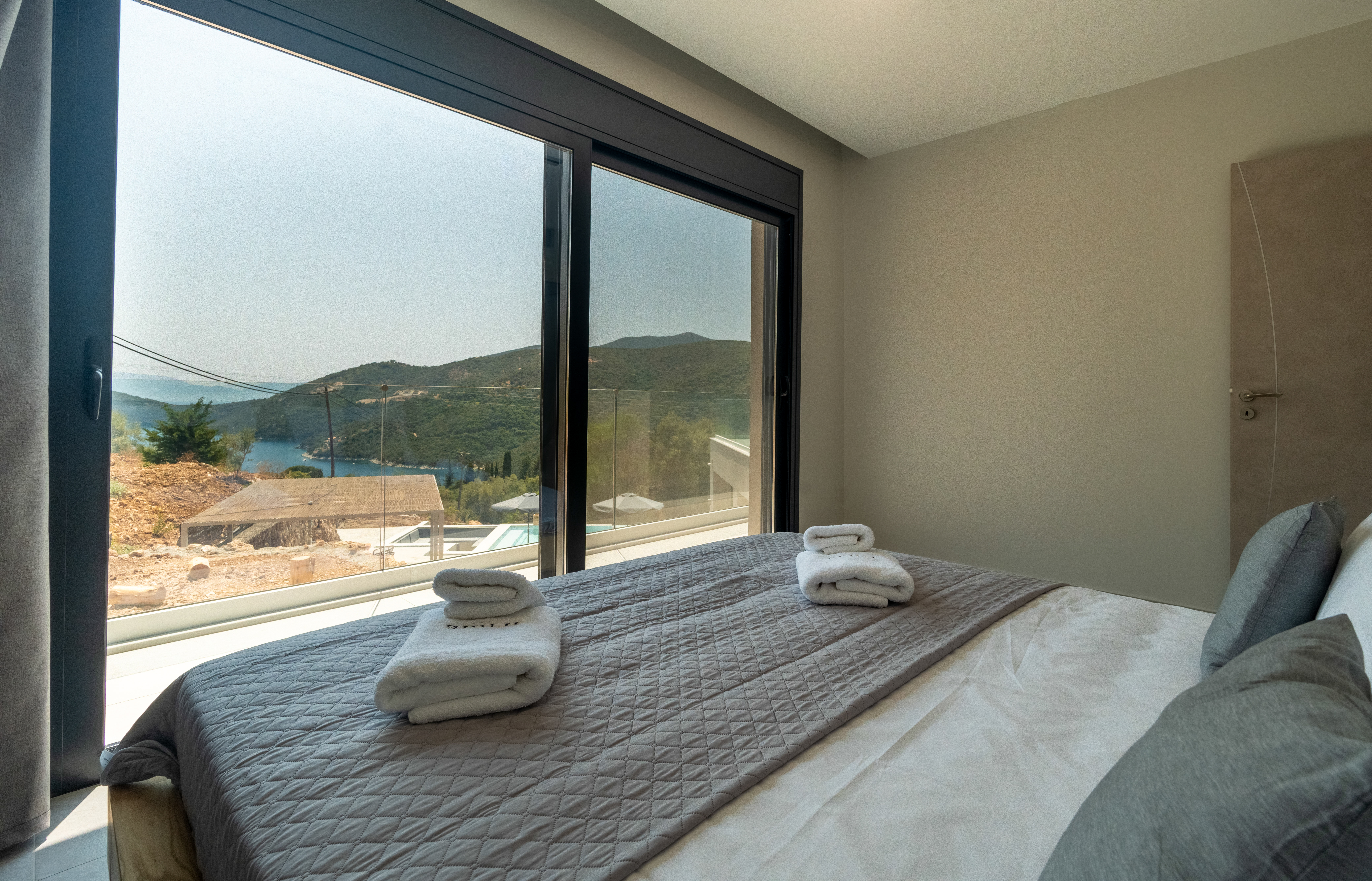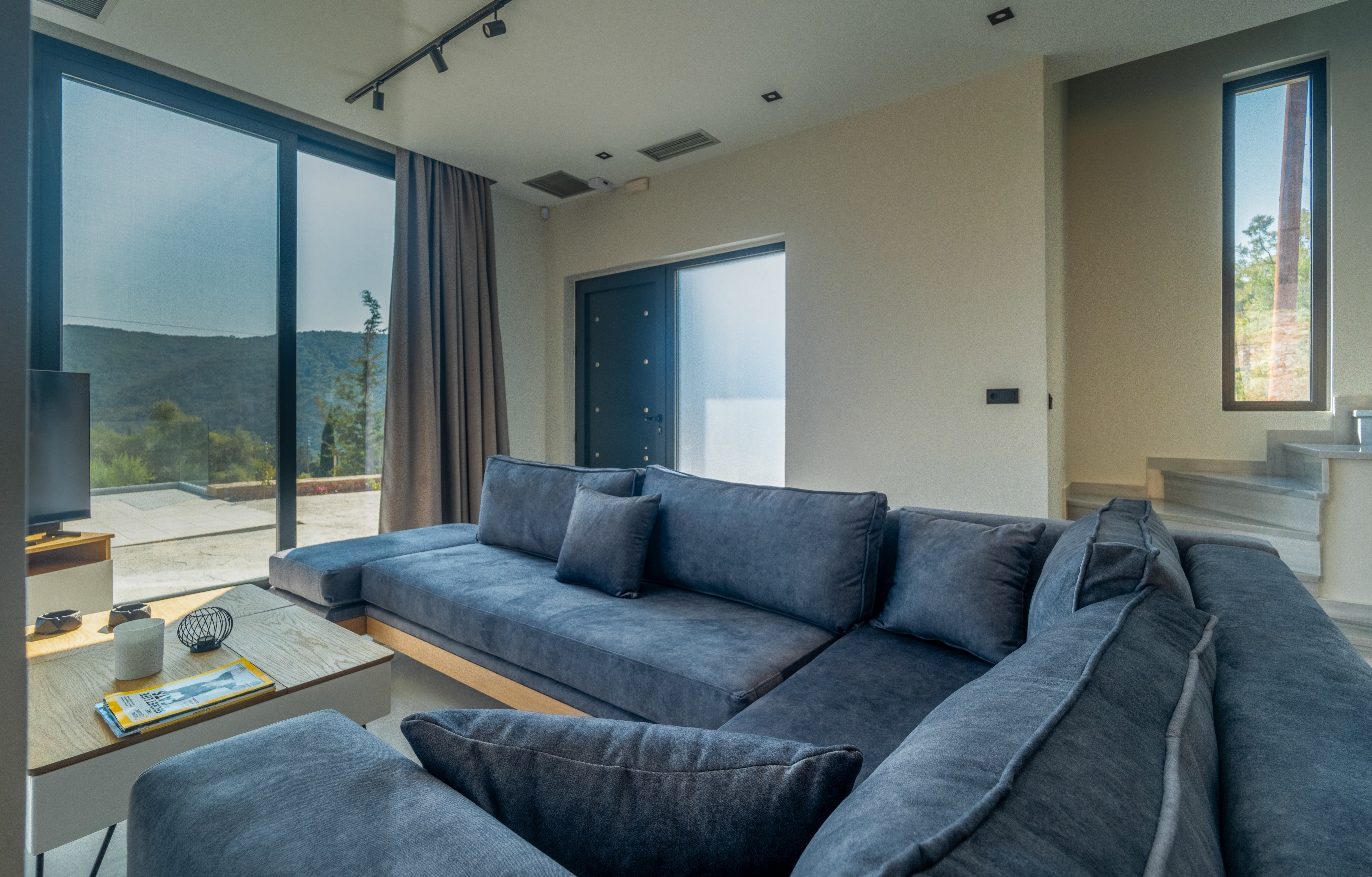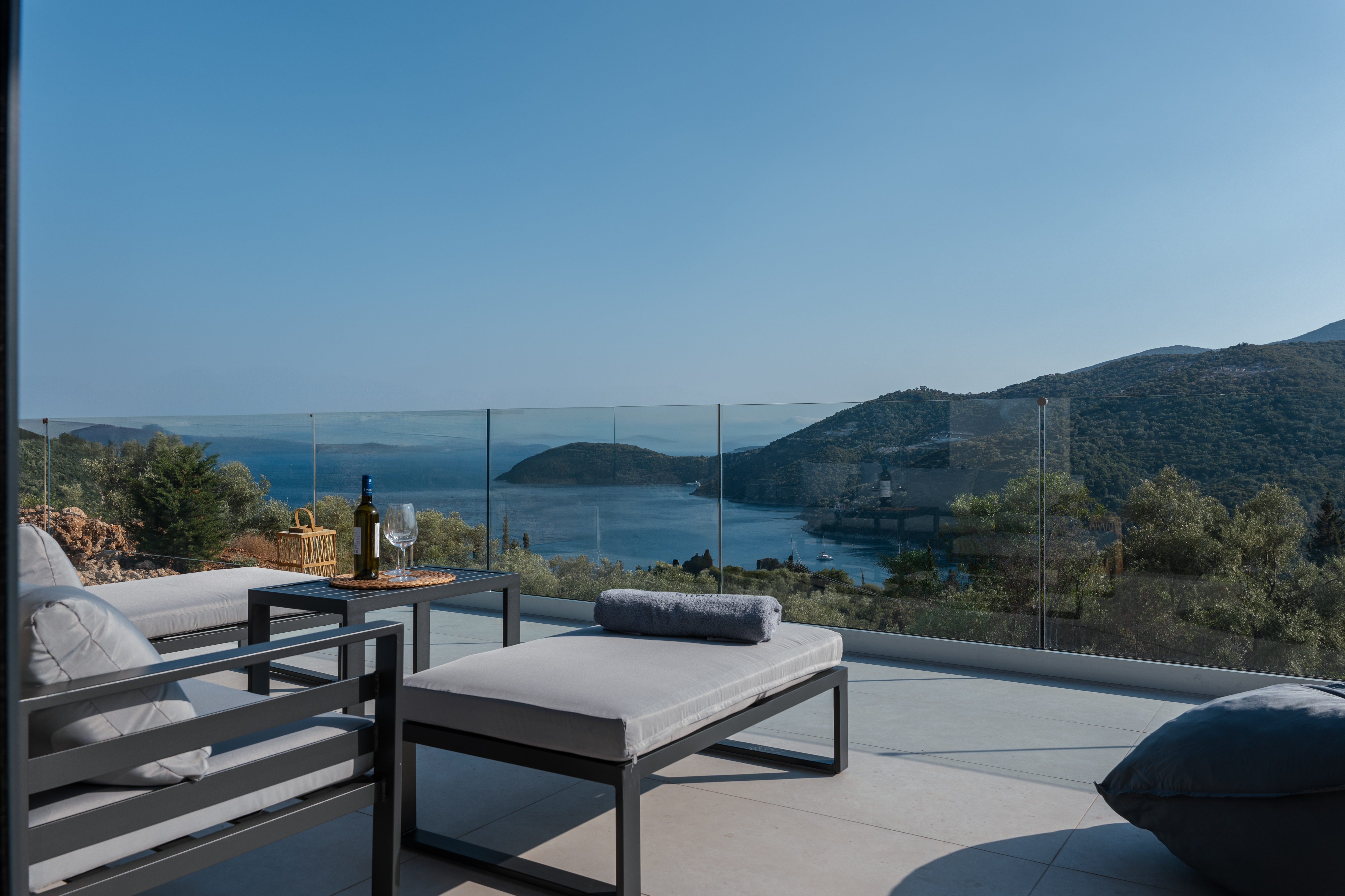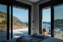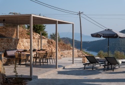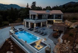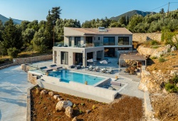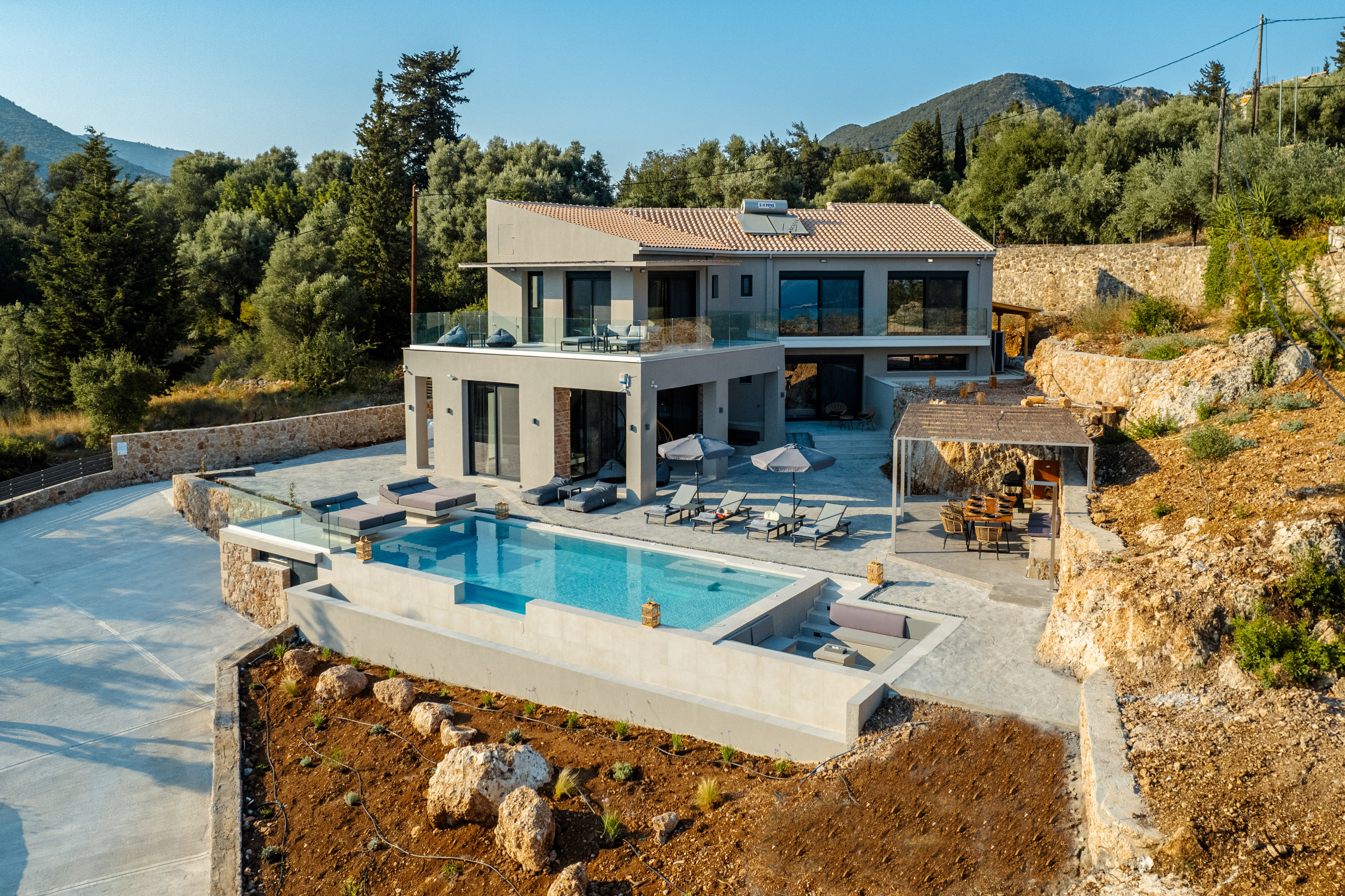 The brand-new Irini's Villa is in Lefkada on the verdant mountainside, surrounded by the olive trees of Poros. This property exudes tranquility, and its architecture organically integrates with the landscape. The expansive living area of the villa, which is created by the floor-to-ceiling sliding glass doors, will captivate you with its indoor-outdoor synergy. The section in front of you has a large lounge area and a kitchen with a dining area. The villa has five bedrooms, six bathrooms, a walk-in shower, and all the conveniences of a home. It also has a terrace and views of the Ionian Archipelago. A private pool with hydromassage, a safe box, a TV, air conditioning, a microwave and dishwasher in the kitchen, and private parking are further amenities. Your evening alfresco moments will be enhanced by the fully furnished BBQ, which is ideally located just outside the kitchen, and the outdoor eating area, which offers breathtaking views of the countless luxurious yachts that are slowly mooring into Mikros Gialos. The villa can accommodate from 6-10 guests. On the Ionian island of Lefkada, Irini's Villa offers all the comforts and extravagance you may require for your next Greek vacation.