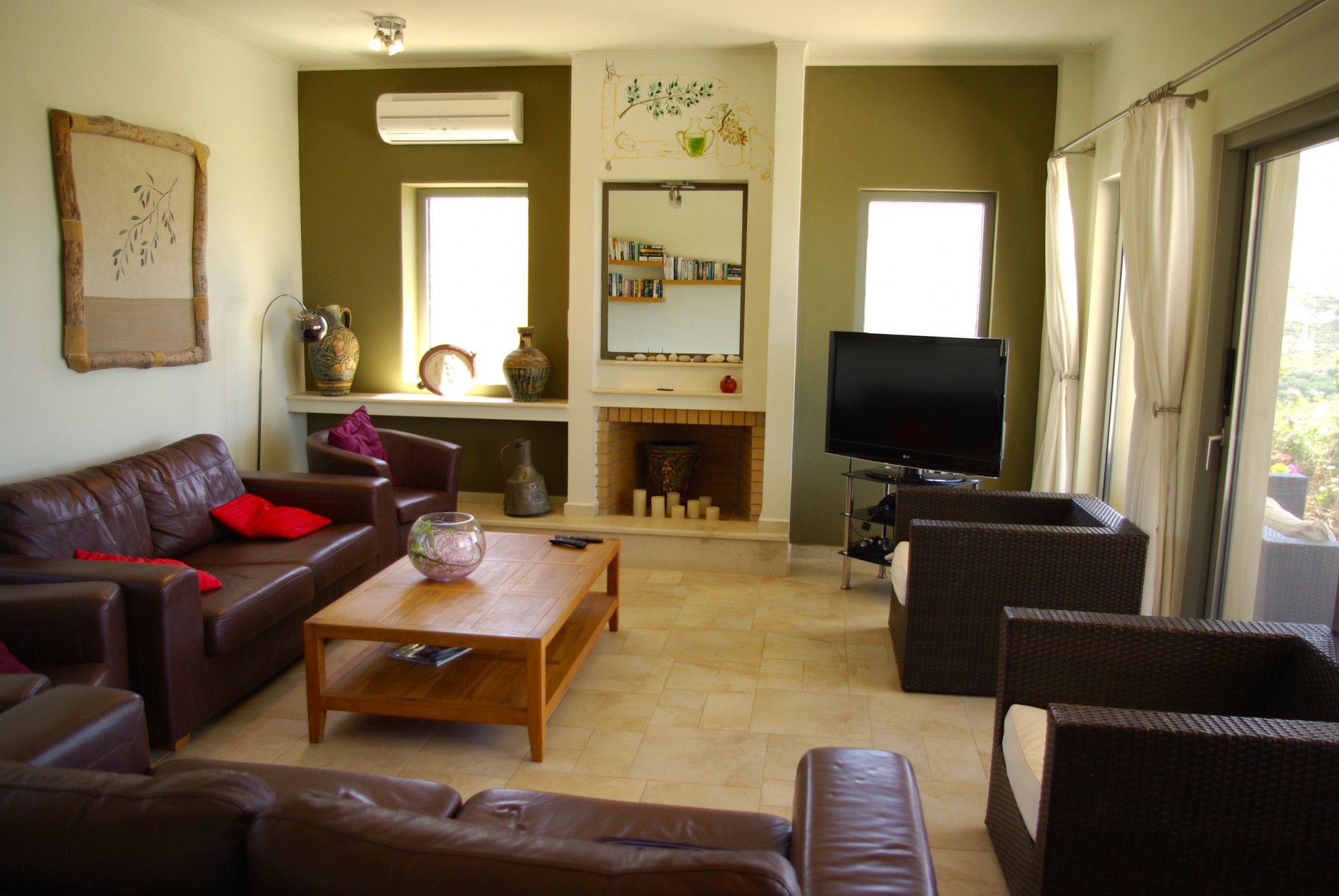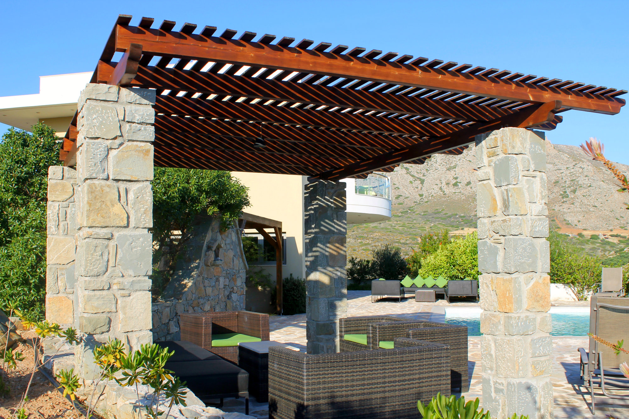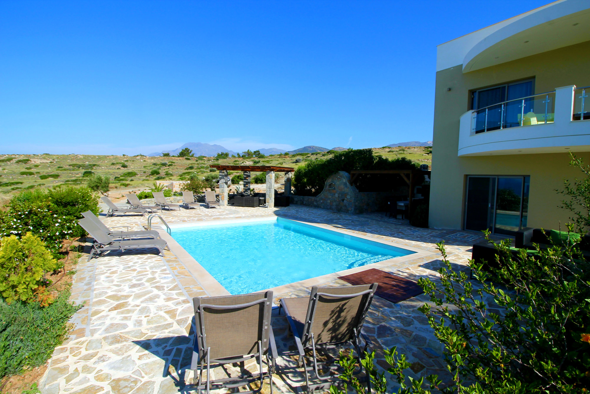 Lagada Villa has 5 bedrooms and 3 separate balconies + roof-top terrace fully equipped. The dining room on the ground level can accommodate ten guests and has an open fireplace and a huge lounge area with a leather three-piece suite and a 42-inch TV. Along with the kitchen, the ground floor also houses a family bathroom, a bedroom, and an en suite bathroom. Upper floor are the other four bedrooms and bathrooms. Outdoors, you will see the swimming pool with BBQ facilities, sunbeds, and umbrellas.