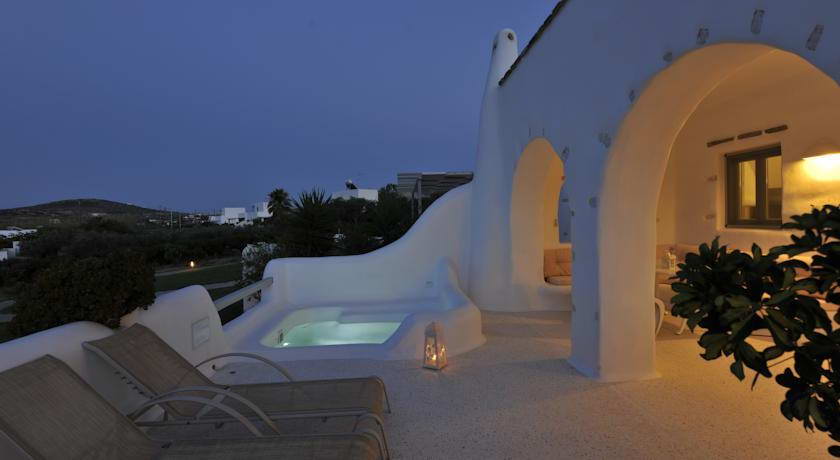 Every villa has a cozy living space with a wall-mounted flat-screen TV and DVD player, as well as two bedrooms. A huge Inox refrigerator, a tea/coffee machine, and a contemporary eating space are all featured in the spacious kitchen.You may relax in the eco-friendly pool and on your balcony with a private hydromassage area. The luxurious rooms at Angels Villa are with built-in beds, sofas, mosaic floors, and traditional Cycladic architecture will make you feel completely at home.
