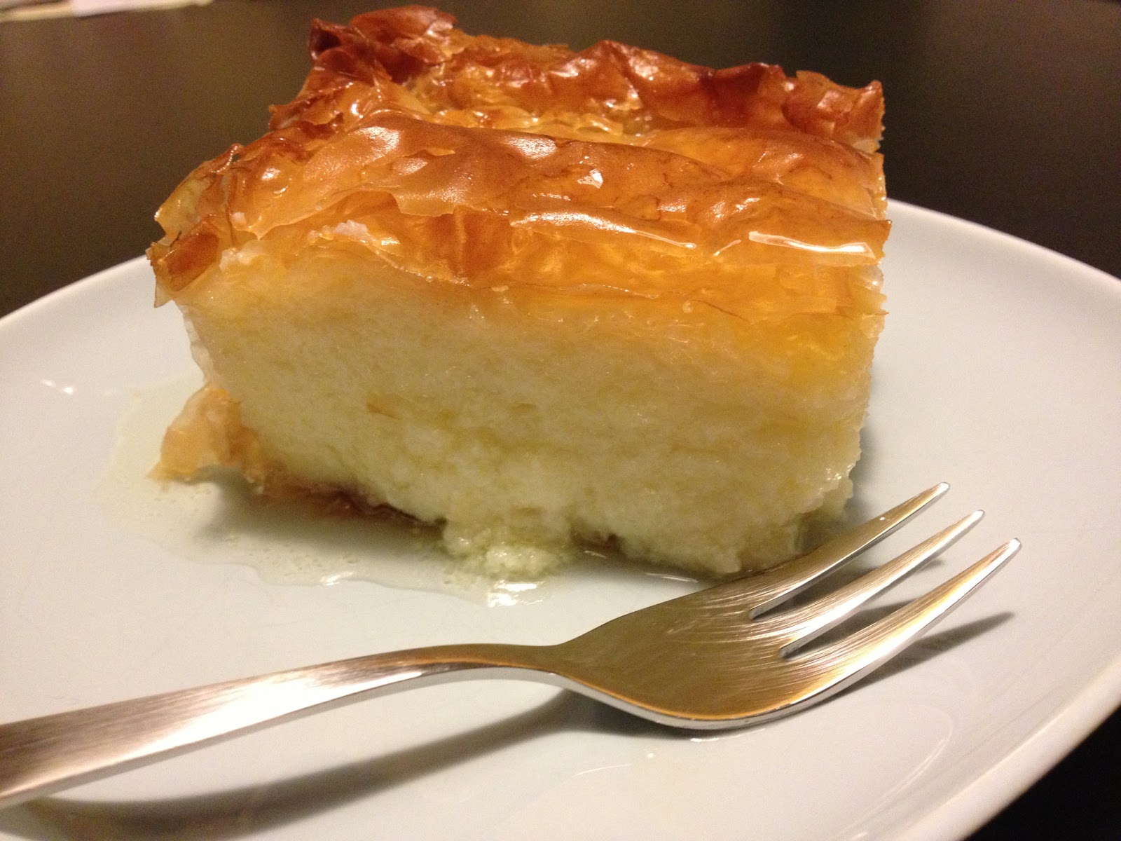 Galaktoboureko is a traditional Greek dessert that is made with layers of phyllo pastry and a creamy custard filling. The custard is made with semolina, milk, eggs, and sugar, and is flavored with vanilla and lemon zest. The dessert is then baked until the phyllo pastry is crispy and golden brown.