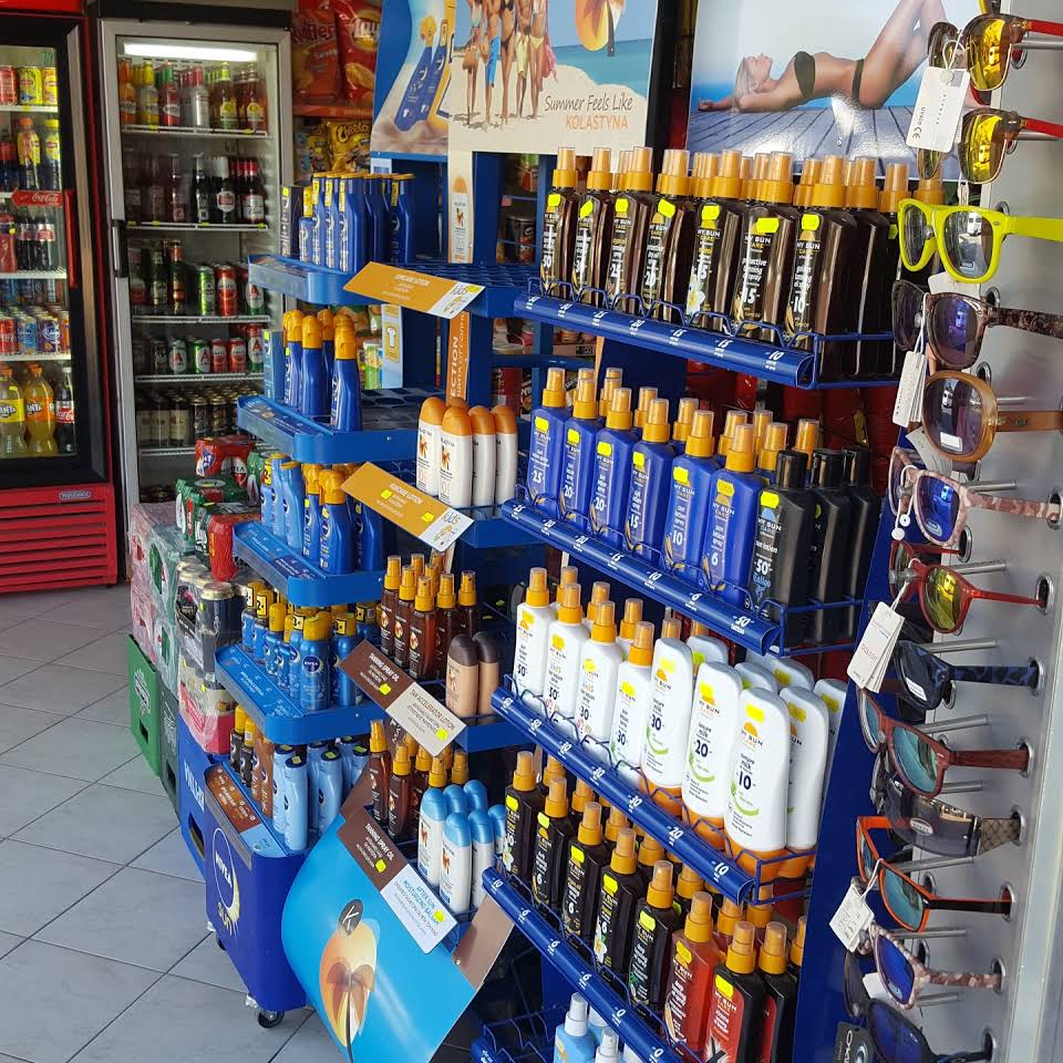 Fresh fridge products such as milk , yogurt, cheeses, beers, wine, traditional drinks and water. Also household cleaning products, beach items, sun creams, cosmetics and souvenirs.