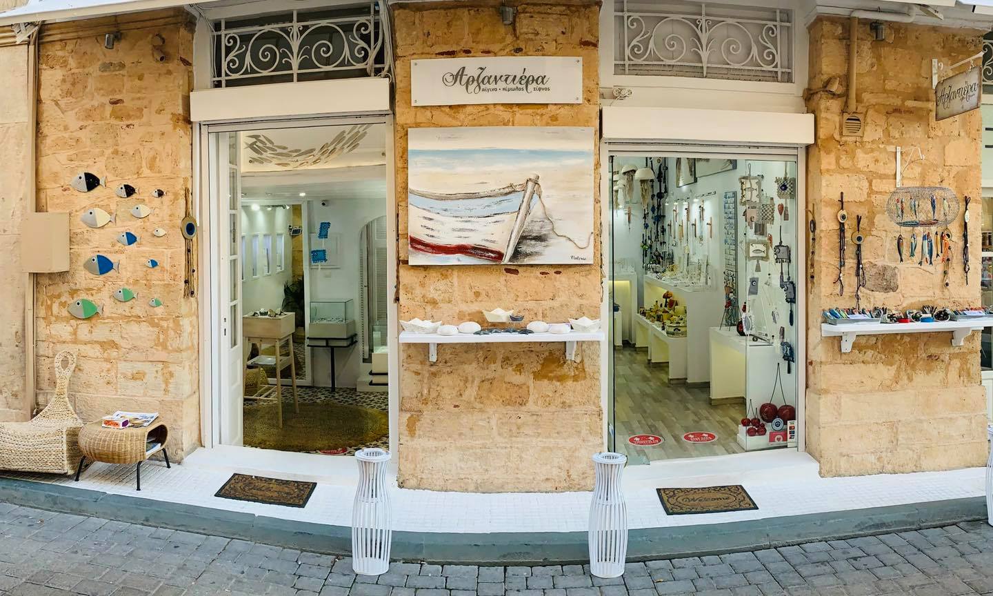 Arzadiera is housed in the beautiful port of Aegina, at the main town, at 2 Aiakou Street, below the port authority. It is an off-white store, which houses a large collection of handmade art creations, which aspire to beautify our lives.
