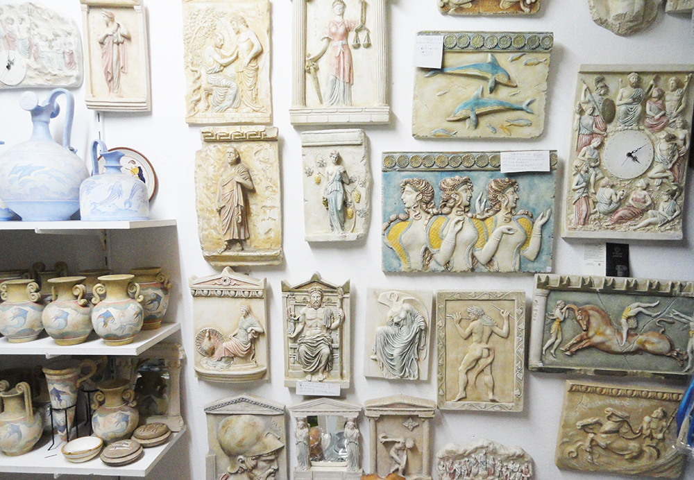After your sightseeing tour of the archaeological site of Knossos Palace, you can head across the road where a souvenir shop is situated. At Knossos Souvenirs in Knossos, Heraklion, you can buy top-quality products at reasonable prices. Here you will find museum copies, handmade marble figures from history and Greek mythology, souvenirs from Knossos, ceramic art, maps, and books. An ideal place for a gift to return home from your memorable visit to Knossos Palace during your holidays in Crete.