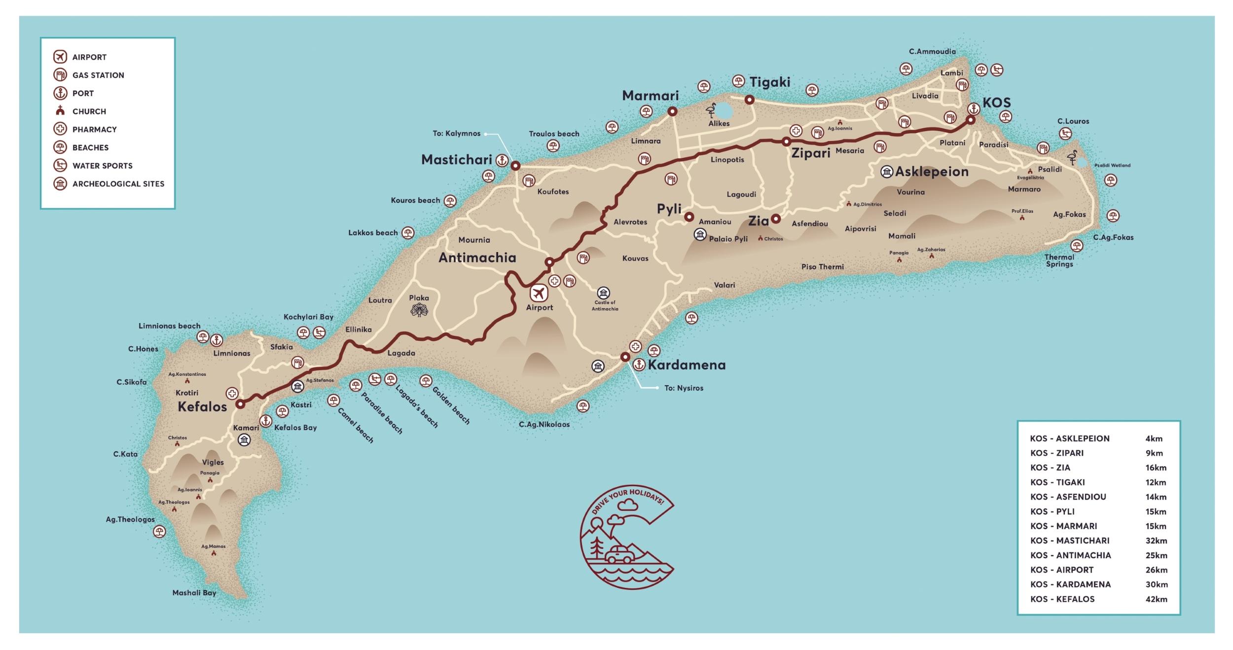 ►Explore the main regions of Kos Island : Kardamena, Kefalos, Kos Town, Mastichari, Tigaki