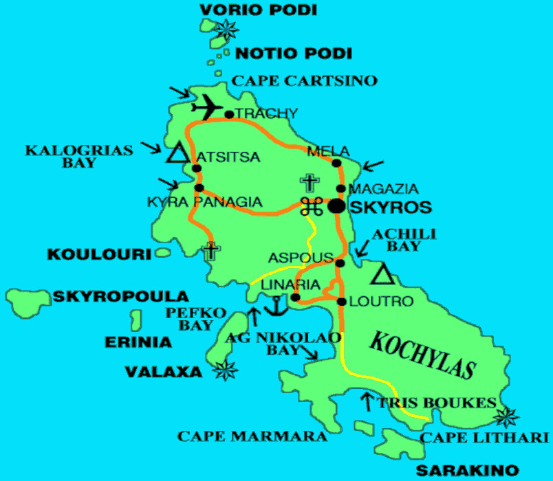 Skyros International Airport receives only domestic flights from Athens and Thessaloniki. The flight lasts 40 minutes, and upon arrival in Skyros, it is convenient to get a taxi since the airport is located 17 kilometers away from Skyros Town.