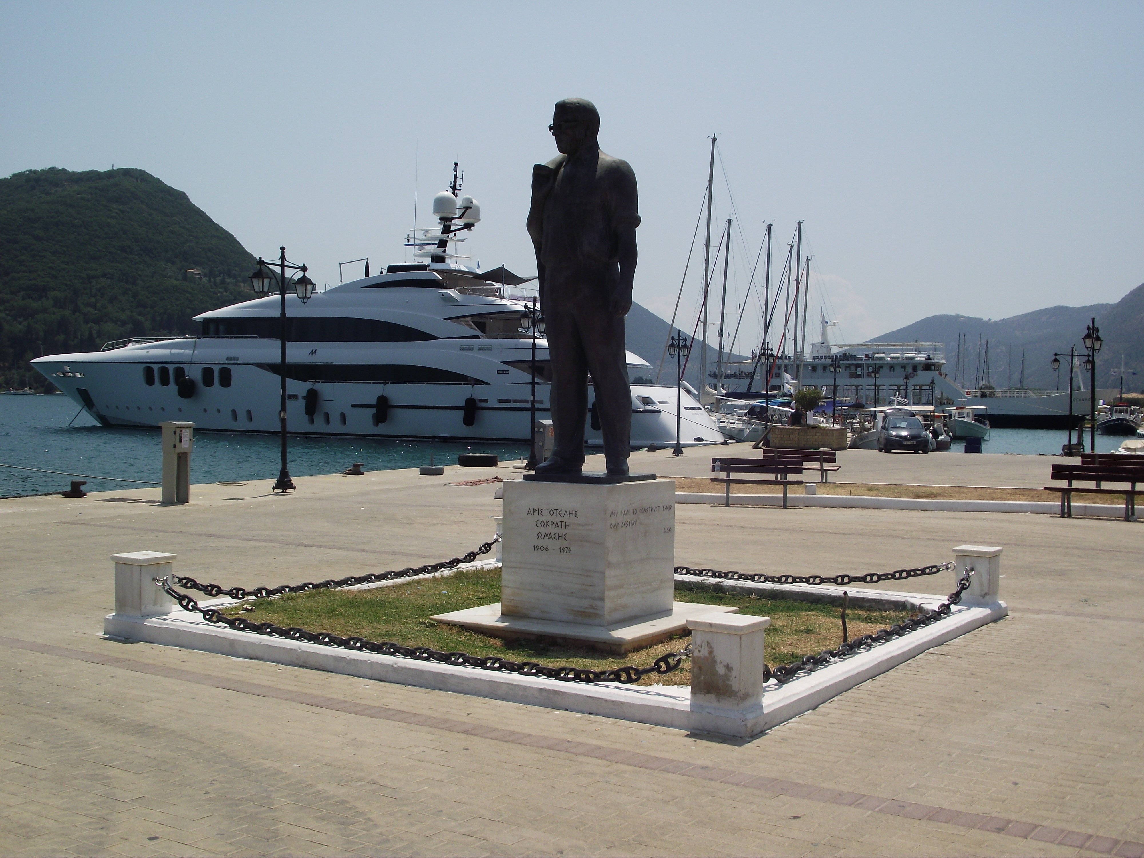Lekada Sights & Monuments - The Aristotle Onasis Statue in Lefkada, Greece stands proudly at the Nidri port. This remarkable statue honors the legacy of the renowned Greek businessman - Aristotle Onasis, who was widely recognized as one of the wealthiest men worldwide. Notably, he frequently sailed from his private island of Skorpios to Nidri, to unwind and relish the local taverns. Plan a visit to the port, to witness the magnificent Aristotle Onasis Statue and pay homage to his contributions.