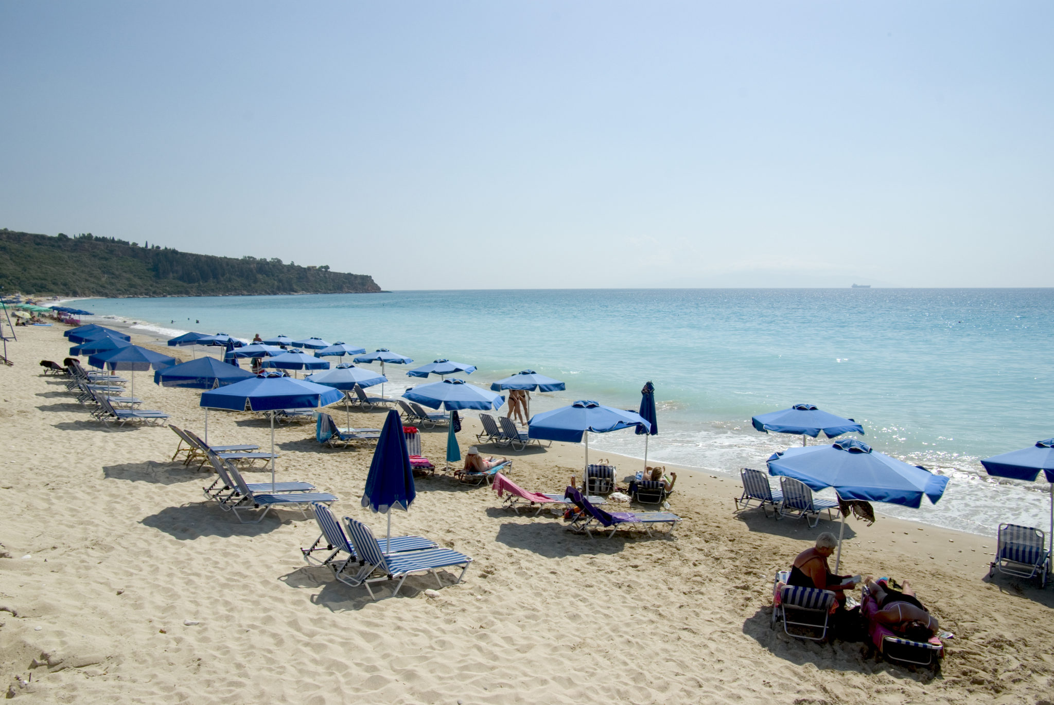 Kefalonia Beaches - Lourdas Beach in Kefalonia, Greece, is a stunning destination situated 17 kilometers southeast of Argostoli. This immensely popular beach boasts a plethora of facilities that cater to all your needs. The beach is set against breathtaking green landscapes and magnificent waterfalls cascading down from the mountains. Rent umbrellas and sunbeds for a comfortable stay at Lourdas Beach. Commuting to this beach from Argostoli is very convenient with public buses readily available. Plan a visit to Lourdas Beach in Kefalonia for an unforgettable experience.