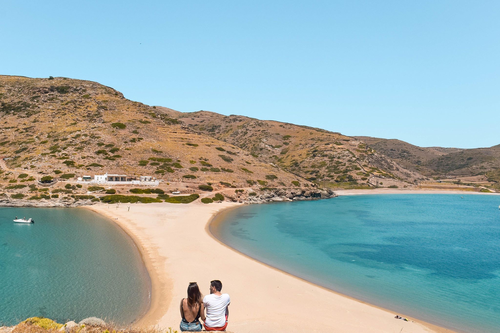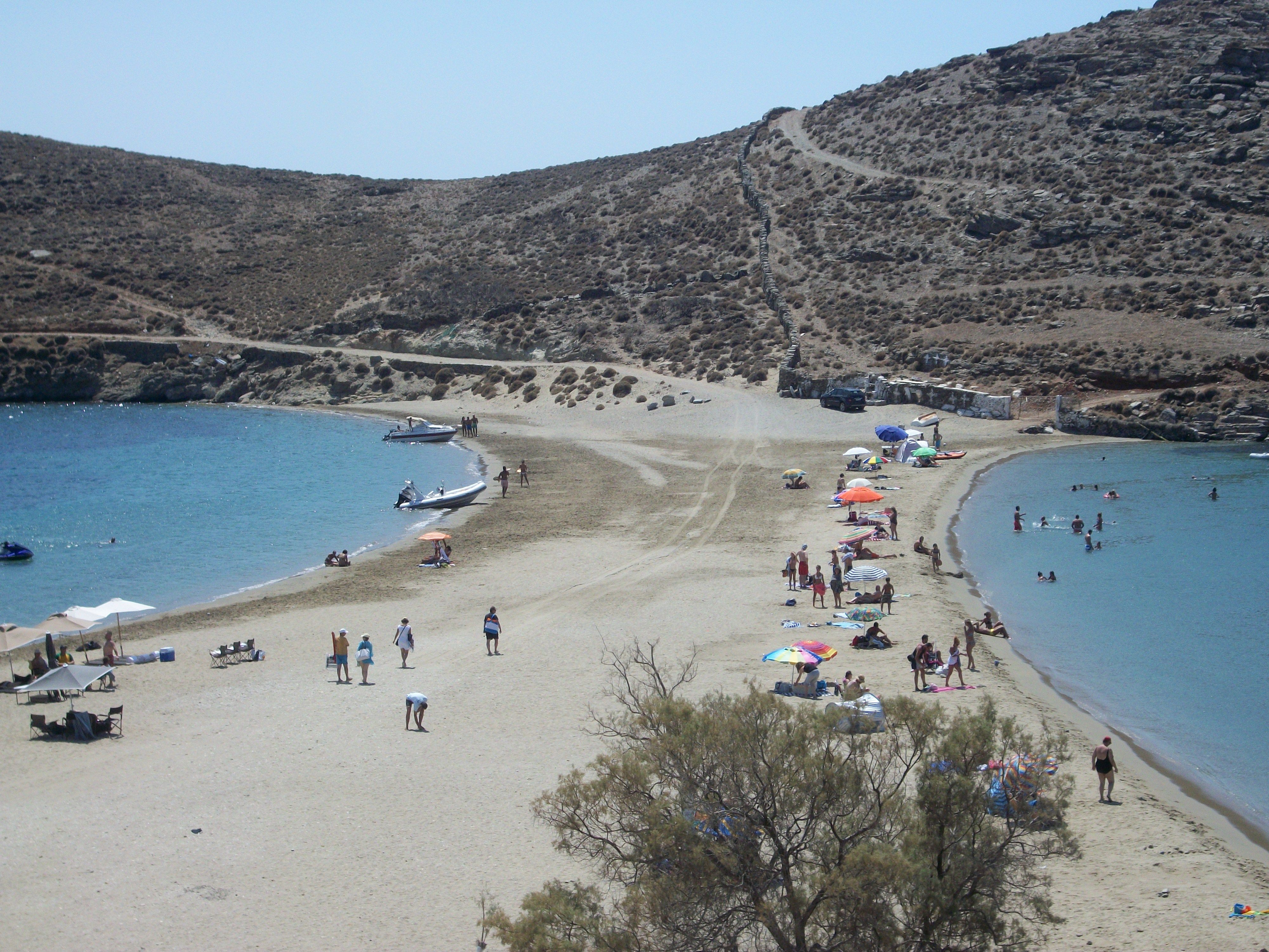 Kythnos Beaches - Kolona Beach in Kythnos, Greece is a breathtaking destination located on the northwest side of the island. This stunning beach is comprised of two separate beaches, connected by a narrow strip of sand that links the islet of Agios Loukas to Kythnos. While there are no amenities available, visitors can take advantage of the shade provided by two large trees. Accessing this secluded paradise requires a rugged jeep ride or a scenic hike. Alternatively, Kolona Beach can also be reached by boat for a truly picturesque experience. Don't miss the opportunity to visit Kolona Beach during your travels to Kythnos, Greece.