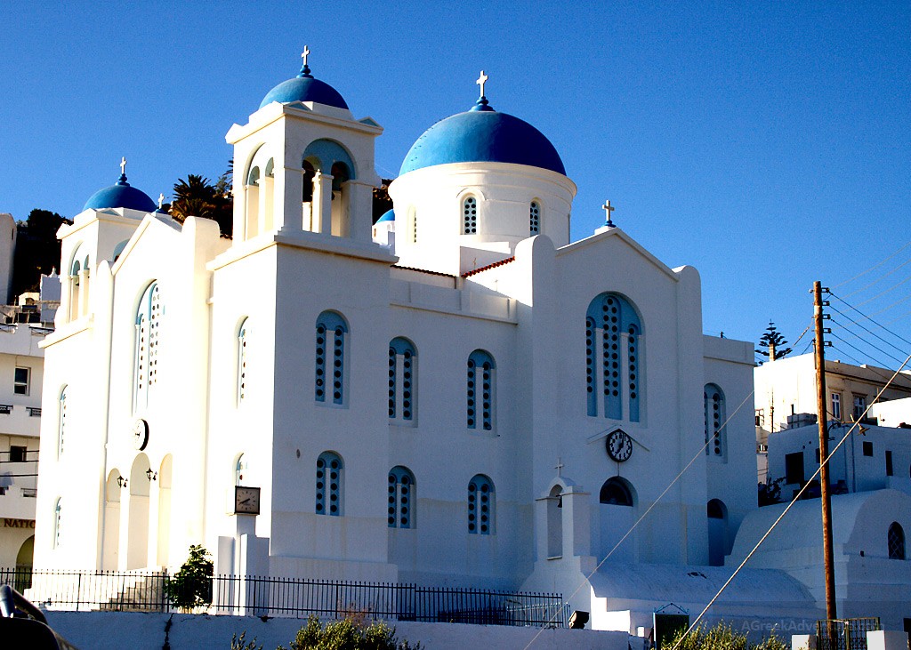 Ios Churches & Monasteries - The Cathedral Church Evangelismos is the pride and centerpiece of Hora, with its awe-inspiring beauty and spiritual significance. As the Cathedral Church in Ios, Greece, it stands tall and majestic, painted in the quintessential Cycladic colours of blue and white. The interior of this magnificent structure is adorned with intricate and exquisite decorations and fine icons, making it a must-see destination for tourists and pilgrims alike.