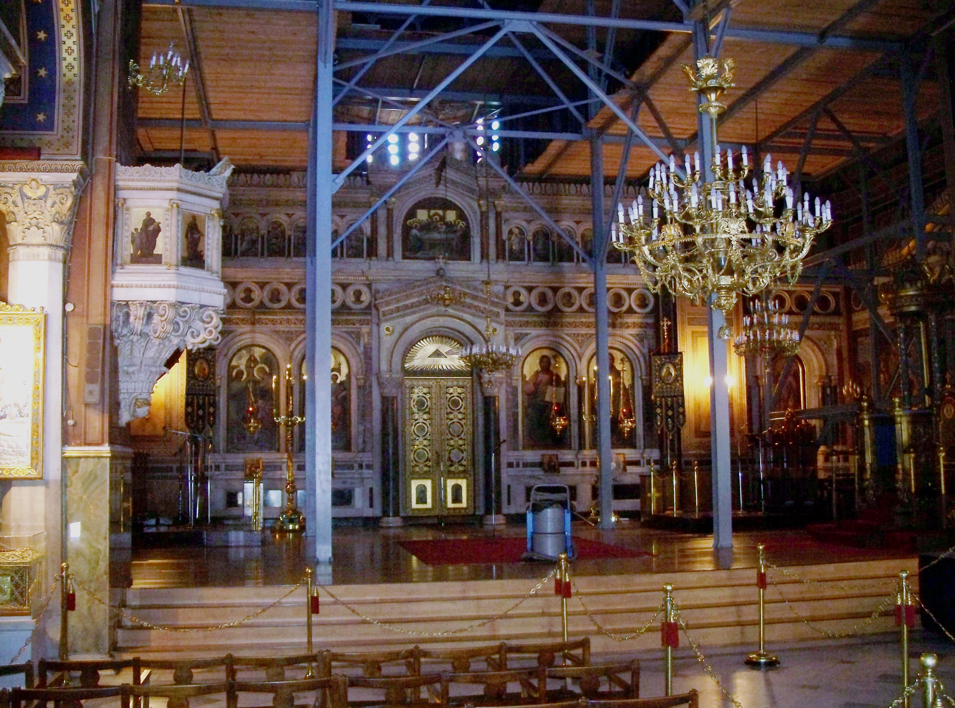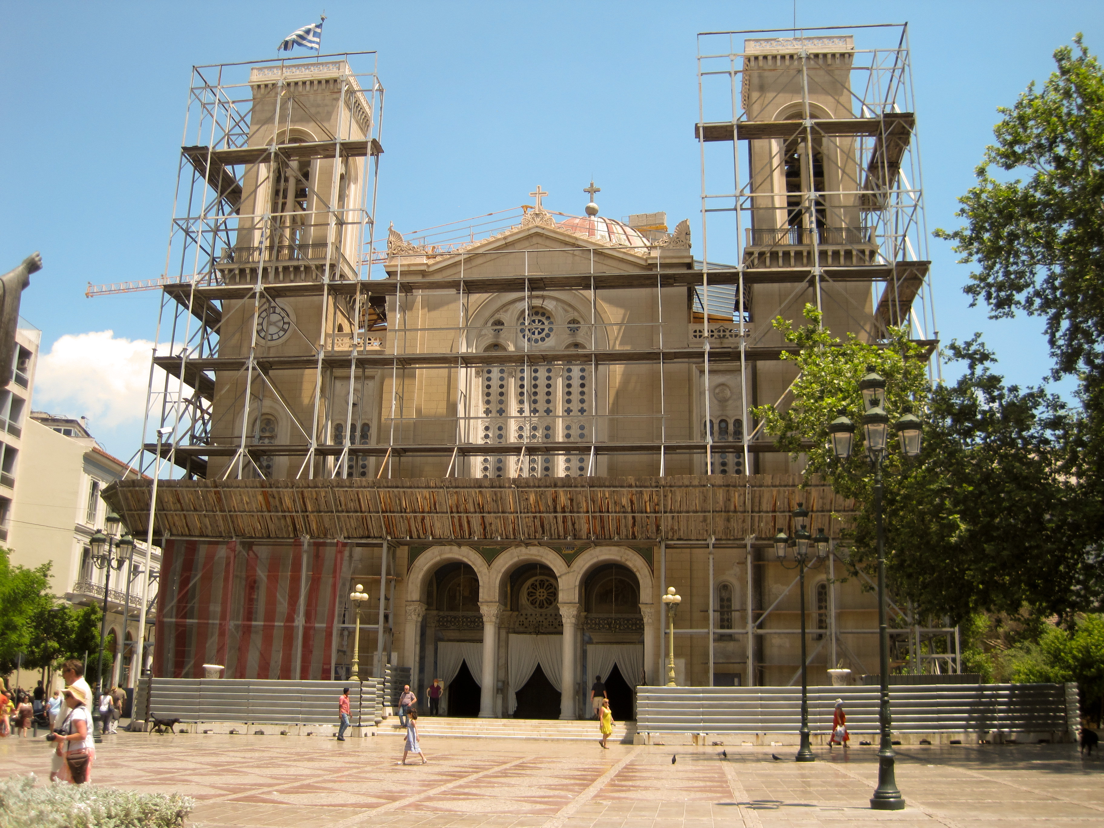 Athens Churches & Monasteries - The Metropolitan Cathedral of Athens, Greece, has a rich history dating back to its foundation on Christmas day in 1842. This awe-inspiring structure was built using marble from 72 demolished churches, and today serves as the cathedral of the Archbishop of Athens and all of Greece. With its three naves and cupola, the Metropolitan Cathedral houses the tombs of two saints who died during the Turkish attack. In 2009, the cathedral underwent a summer renovation and was closed to visitors. A small basilica can be found behind this majestic cathedral. Discover the beauty and history of the Metropolitan Cathedral of Athens, Greece.