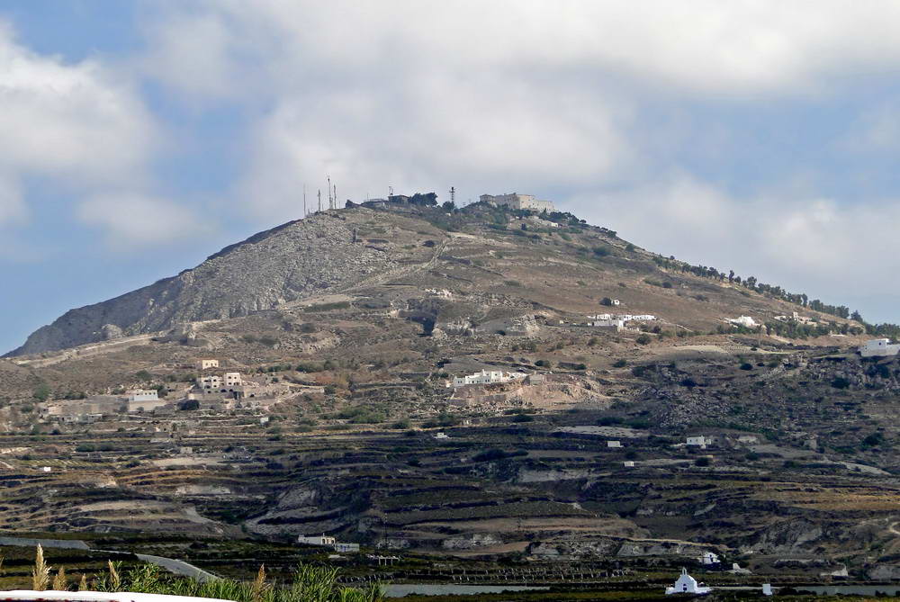 Ssntorini Chuches & Monasteries - Located between Pyrgos and Kamari on the island of Santorini in Greece is the Monastery of Profiti Ilias. This historical site sits atop the highest point of the island, Prophet Elijah mountain, which reaches 567 meters. Not only will you enjoy stunning views of the patchwork agricultural plains and the hilltop village of Oia, but you'll also be able to explore the monastery itself. Built in 1712, the walls surrounding the Monastery of Profiti Iliain resemble a fortress and are steeped in significant history. The monastery once had its own ship, conducting private business and serving as an active influence on the intellectual and patriotic life of Santorini. From 1806 to 1845, it even ran a school teaching Greek language and literature. Although the monastery's decline began in 1860 and suffered damage from earthquakes in 1956, today, it boasts an impressive collection of Greek Orthodox religious artifacts, icons, bibles, books, and ethnographic material. It also features exhibits on shoemaking, printing, candle making, wine making, and local cuisine. Discover the Monastery of Profiti Ilias in Santorini, Greece, for a truly enriching experience.