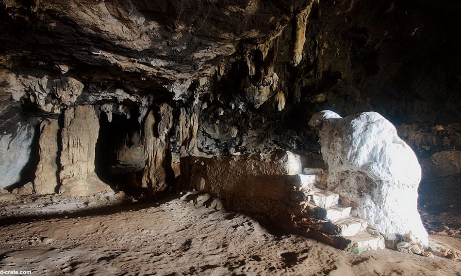 Chania Caves - The Cave of the Bear, also known as the Virgin Mary Arkoudiotissa, is a sacred site in Chania, Crete. Located on the path from Gouverneto to Gatholiko, this cave houses a chapel dedicated to the Virgin Mary. As you approach the entrance, you'll see a grey stalagmite shaped like a bear and a small pond. Archaeologists believe that in ancient times, the cave was a sanctuary for the goddess Artemis, who was said to have transformed into a bear. Inside the cave, you'll find inscriptions and reliefs of Apollo and Artemis. Today, the cave is an old riverbed with a large hall adorned with ancient relics that have been blackened by fire. Beyond the hall is a smaller chamber that can be accessed through a narrow passage. While its width may be too small to explore further, the Cave of the Bear remains a must-see destination for visitors to Crete.