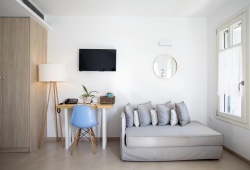 Two buildings make up the complex known as Anemomiloi Andros Studios. Nestled in Chora or Town on the magnificent island of Andros, this property offers panoramic views, Cycladic architecture, great hospitality, and an amazing position. In the brand new main apartment building, there are 13 modern-designed apartments: 8 Deluxe Doubles and 5 Superiors, ideal for families or groups of friends. Both buildings have outstanding views of the sea and the green valleys. The Anemomiloi Studios provide air conditioning and a kitchenette with a fridge, stovetop, and utensils. Each has a couch and an LCD TV. Traditional products might be offered for breakfast at a nearby property's pool area. You can use the bar for beverages and cocktails as well as the pool for relaxing. Andros Town features charming squares with stores and bars, as well as neoclassical buildings. It takes ten minutes to walk to the Museum of Contemporary Art and the Gavrio Port is around 35 kilometers away. Every Anemomiloi Studio has all the amenities required and a list of places to visit so that guests may enjoy the most restful vacation possible on Greece's Andros Island.