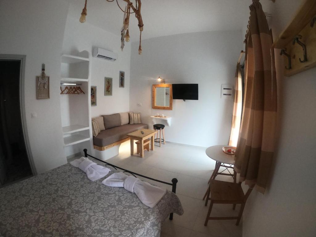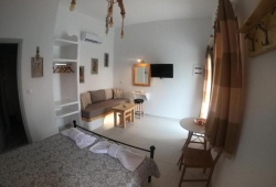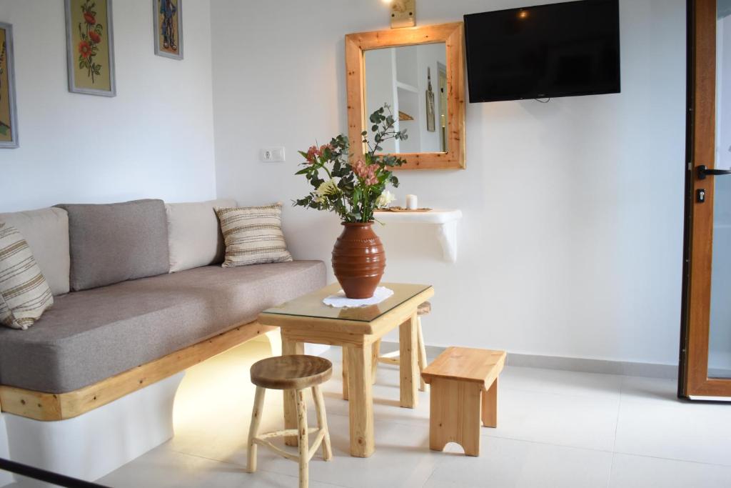 The peaceful village life is yours with Dreamcatcher of Zeus. Five minutes' walk from the town square, this accommodation is situated at the entrance of Filoti, a traditional settlement in Naxos. Here, at the base of Mount Zeus, you may take in the cool wind. (Cyclades' tallest peak, at 1004 meters). This property's design and aesthetics have been carefully considered, drawing inspiration from the village's traditional way of life and modern conveniences, nearly every piece of furniture, light, maid, etc. Every room at the Dreamcather has a distinctive décor that reflects the village's traditional way of life. Most have a kitchen/living area and a bedroom. The bedroom features a 32-inch Smart TV, air conditioning, a toilet, a wardrobe, and a double bed. In addition to having all of the necessary culinary tools, the kitchen space also has a couch bed, air conditioning, and a 32-inch Smart TV.