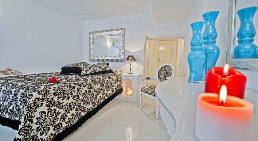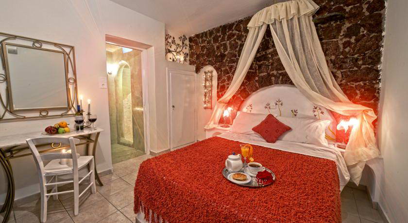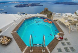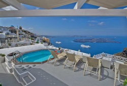 Thea Apartments in Imerovigli Santorini, with refurbished rooms and suites, have a contemporary style, combining cutting-edge, bespoke design alongside traditional handcrafted furniture and luxurious bathrooms. The studios, suites, and apartments feature arched walls and built-in beds, and some enjoy views over the Aegean Sea. This cozy Santorinian home is perfect for families or couples. It contains a tiny kitchen and a living room. Access to the hotel's spacious patio, which features a small pool and views of the Aegean Sea, the sunset, and the Caldera, is available from the balconies.