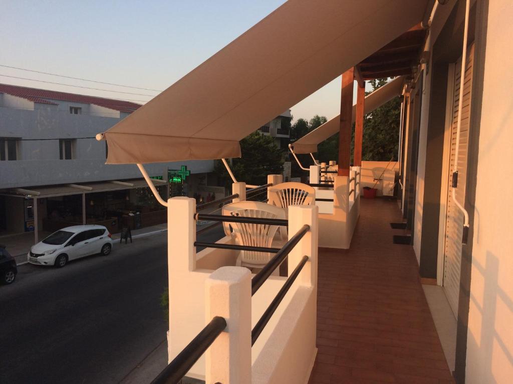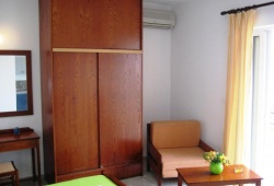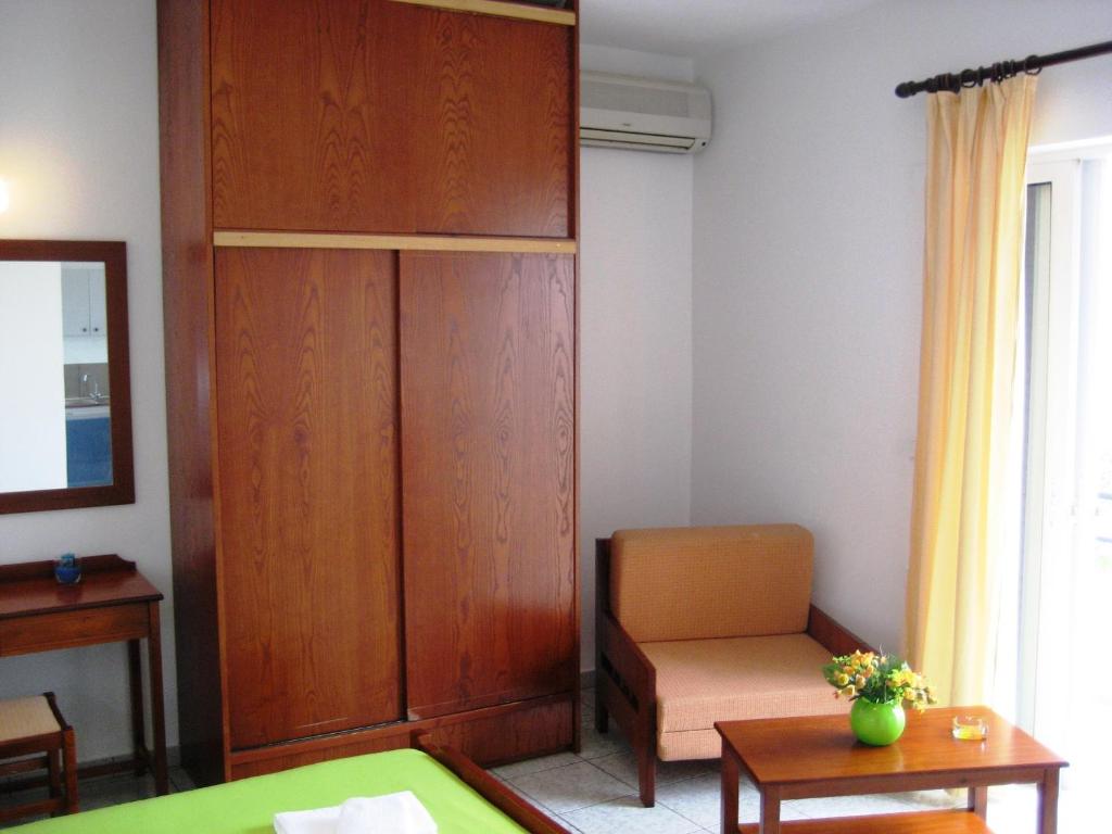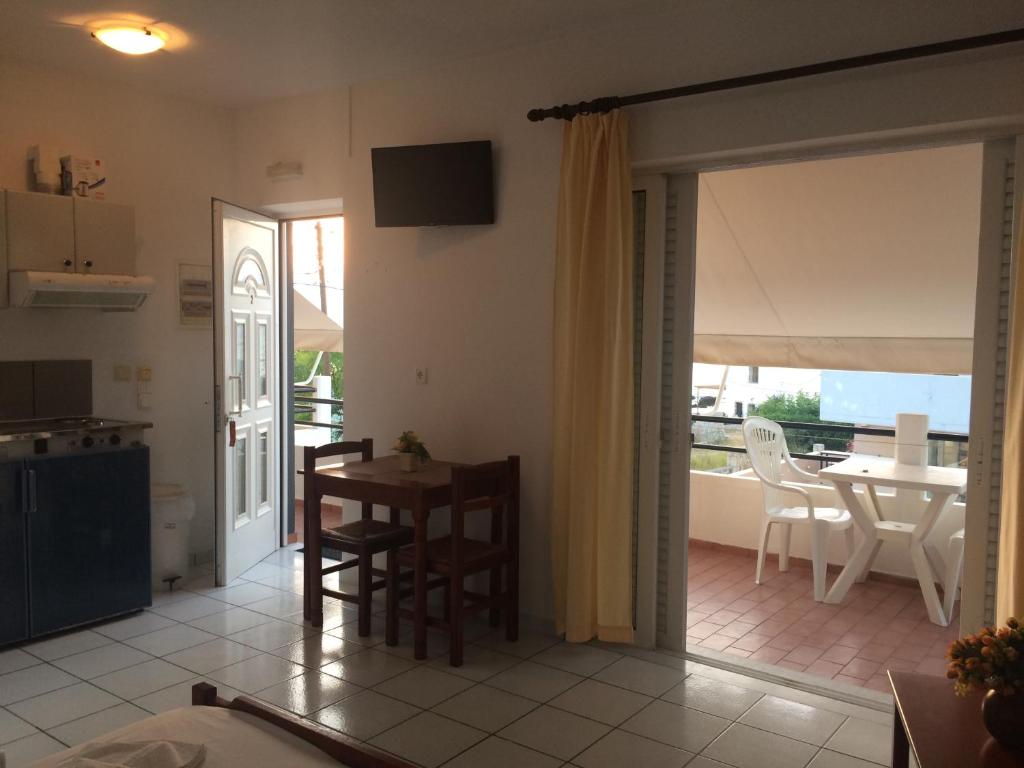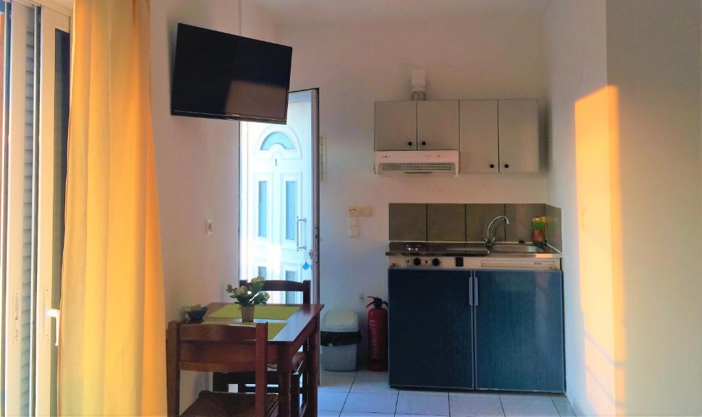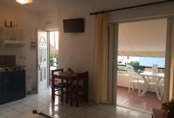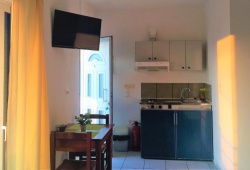 The studios of Ouranos have a well-equipped kitchenette with a dining table, refrigerator, and cooking hobs that opens to a furnished balcony. They are all furnished with TVs, heaters, and air conditioning. There is a shower in the private lavatory.