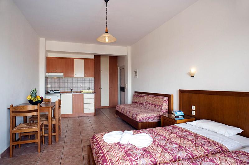 Equipped to perfect your stay, the Chania hotel features 14 studios accommodating 2 guests, 8 studios that fit 3 guests, and 8 apartments with a capacity for 2-4 guests. All studios and apartments include a separate WC with a shower and hot water throughout the day, as well as an emergency call system. For your comfort and convenience, we have also included air conditioning, satellite TV, a direct dial telephone, music, and a safe-deposit box for the safe-keeping of your personal belongings. To add to the charm of our Crete apartments, all rooms have been elegantly accented with a balcony or terrace with a view of the magnificent sea and the exquisite surrounding area. Book Now! and compare rates offered by various online booking services.