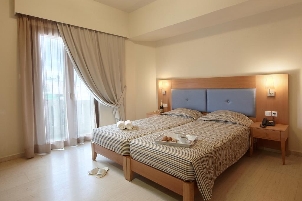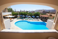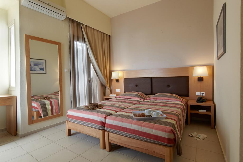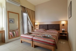 The family hotel Dimitra Hotel is located at an excellent location just 200 meters from Kokkini Hani beach of Heraklion. The hotel consistently maintains its amenities and services at a quality that satisfies the needs of today's travelers. You will sense the welcoming attitude of the family from the moment you arrive until you leave. Your personal service, comfort, and relaxation are the main objectives. There are twelve self-catering units in the apartment structure. The apartments have enough space to accommodate two to four persons each. The rooms are located at the ground, first and second floor and they come with living room area, kitchenette (with two electric rings), kitchenware, refrigerator, kettle, private balcony, bathroom with toiletries, telephone, television, air-condition and Wi-Fi free.