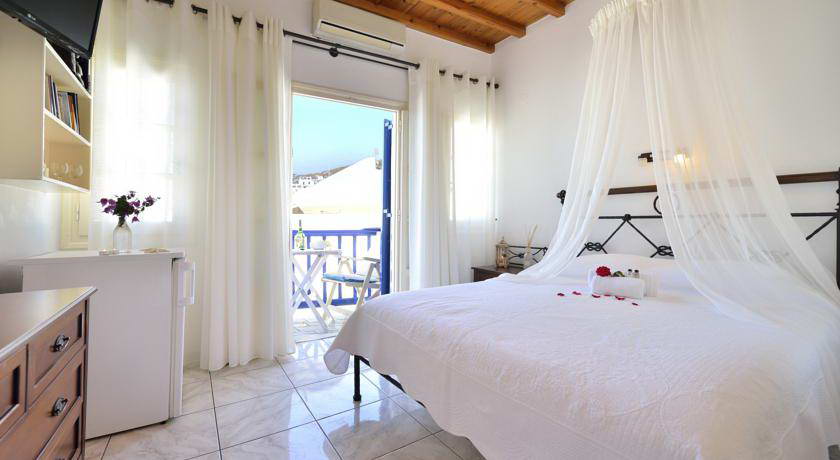 Mykonos accommodation in town is preferred by most tourists, as it offers the convenience of being close to the nightlife happenings of the city. At Marietta's, you can select one of the precious Mykonos rooms, which provide accommodation for up to three people, making it ideal for families, friends, and couples. All apartments at Marietta are well appointed and fully equipped with Cycladic-style furniture, featuring a relaxing ambience where you can truly rest. The unparalleled view of these Mykonos Town rooms over the sea, the sunset, "Little Venice," or the renowned windmills will really amaze you. Marietta's apartments and rooms include tiled floors, beamed ceilings, and mattresses made of leather, white wood, or wrought iron. Every apartment has a refrigerator, a safe, and an LCD satellite TV; some even have a kitchenette.