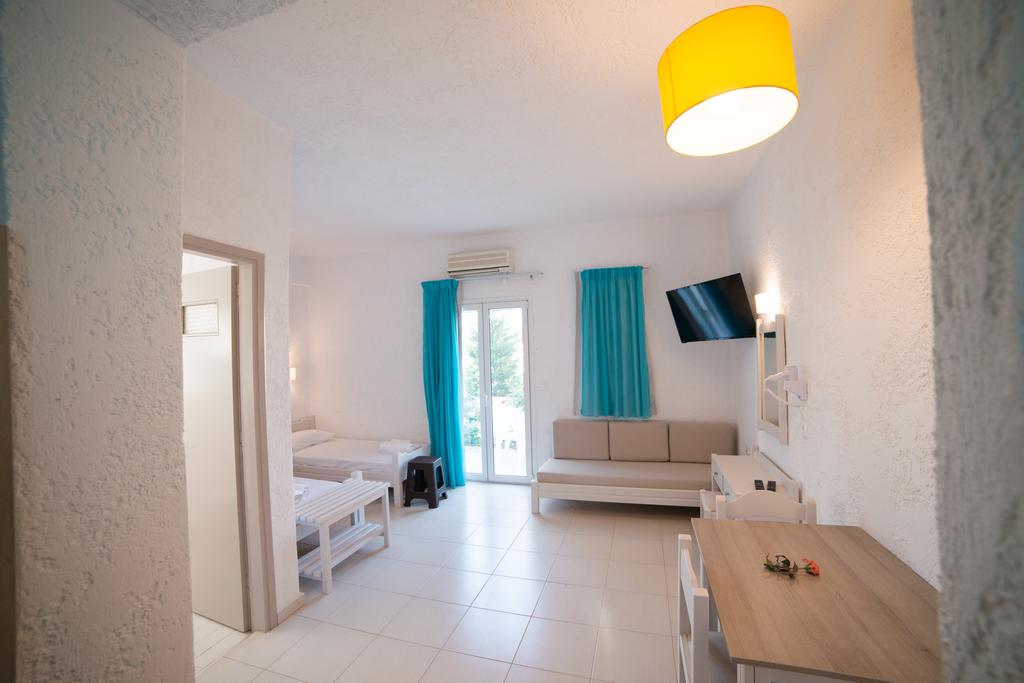 Villa Stella consists of Maisonettes: There are five maisonettes: the red one, the orange one, the yellow one, the green one, and the blue one. Maisonettes are apartments with an inner wooden floor (internal stairs) with one double bed, a kitchen, sitting space, a new bathroom, and a balcony. Free flat-screen satellite TV, free wi-fi, and free air conditioning in the room All maisonettes are located on the ground floor.