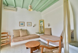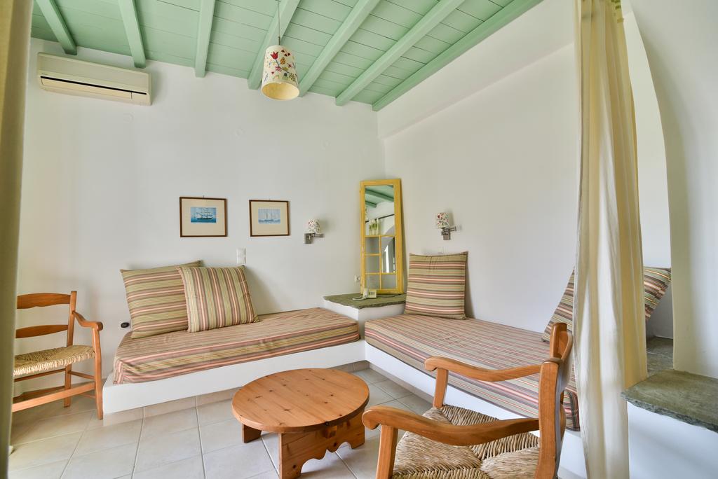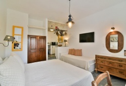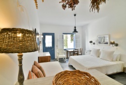 The Golden Beach studio complex dominates the sandy beach of Agios Fokas and is only 2 km from Chora or Tinos Town. Golden Beach Studios is one of the few resorts on Tinos that is surrounded by a lush green area of 15000 sq. m., full of geraniums, palm trees, olive trees, and bouganvilleas. It consists of four independent buildings, creating a small village with lovely yards, white pergolas, flower beds, and comfortable verandas with views to the sea or the garden. A paradise perfect for relaxing and family moments. There is a wide selection of accommodation options that will undoubtedly meet your needs, including studios and suites of various kinds. Each one is exquisite, spacious and traditionally furnished, with conveniences like air-conditioning, flat-screen TV, safe and free WIFI.