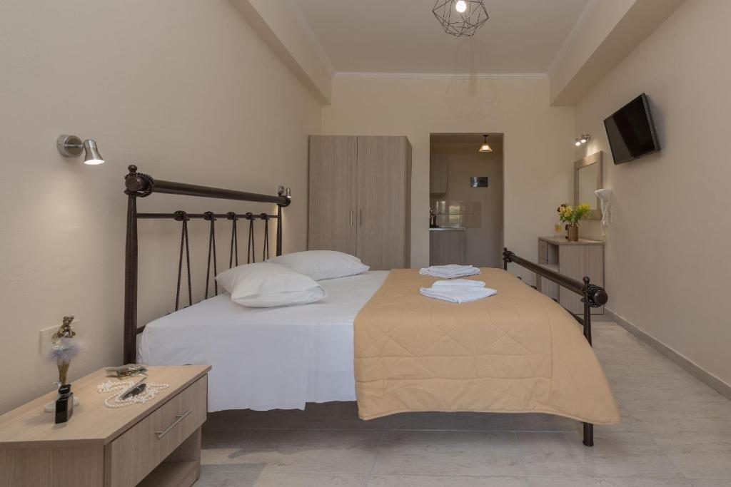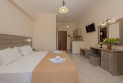 Each of the ten rooms at Costas Studios can accommodate up to three people and is completely furnished. Each room has two single beds, which can be joined to form a double bed. In order to accommodate a third person, a folding bed can be provided upon request. A kitchenette with electric burners, basic utensils, a kettle, a television, and a bathroom with a shower are included in each room.
