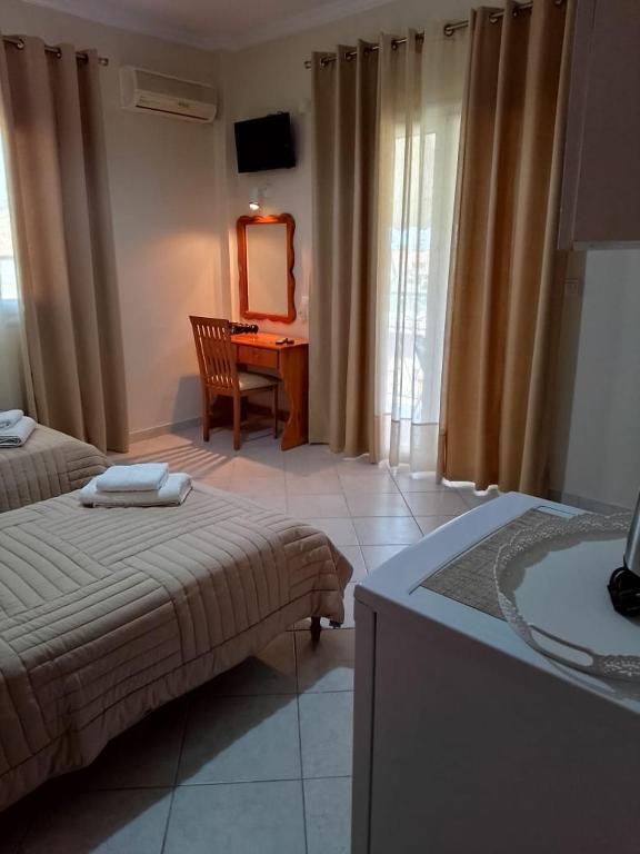 During your trip to Greece, staying at Vicky's Guesthouse in Corfu will make you feel at home. This guest house is very close to the city center of Kavos. You may stroll about the area and visit the Ancient Roman Baths, Kavos Beach, and Port of Igoumenitsa. The apartment has air conditioning, a flat-screen TV with cable channels, and a patio with an outdoor eating area. Towels, bed linens, and ironing are provided. In addition to free WiFi and private parking, the accommodation offers airport transportation and a bicycle rental service. Shops, bars, and restaurants are located in Kavos for your entertainment, while nearby you may enjoy other activities like hiking. Corfu Airport is 48 km away from Vicky's Guesthouse.