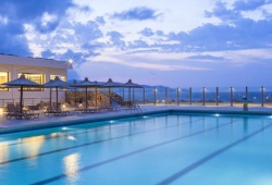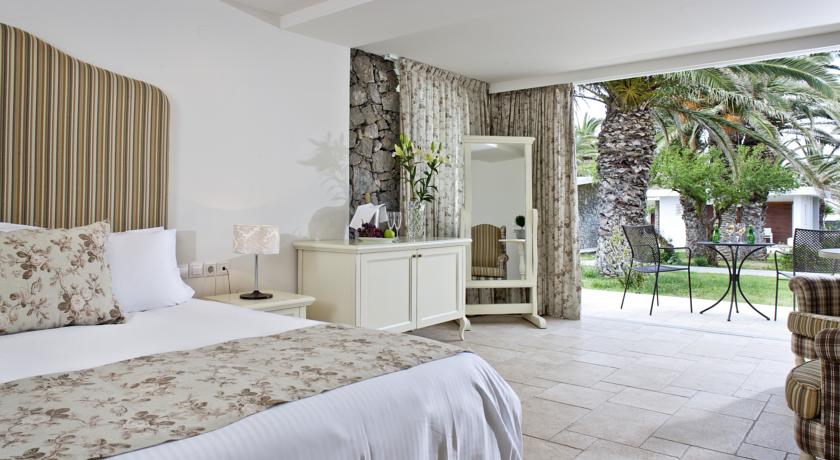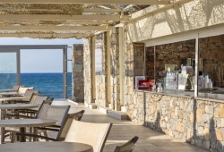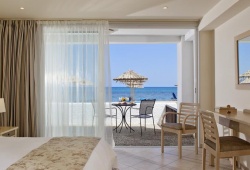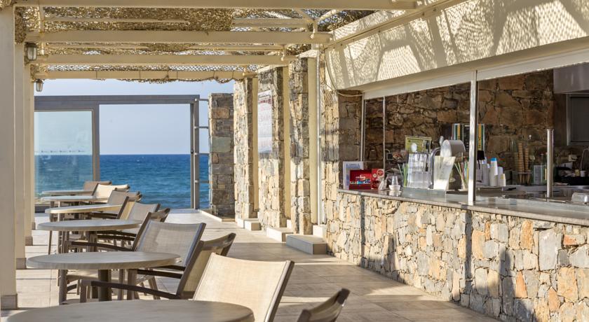 The main restaurant, which is situated next to the beach, provides buffet-style breakfast, lunch, and dinner along with views of the Aegean Sea. Delicious Greek and International cuisine, appetizers, salads, and desserts are available at the a-la-carte restaurant. The hotel has tennis courts, beach volleyball, and a sizable swimming pool with sunbathing space. Evening entertainment is available. A mini-club and separate swimming pool are available for kids.