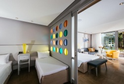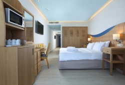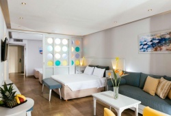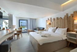 The rooms feature sea- or garden-view double rooms, family rooms, and suites with or without a swimming pool, all equipped with free Wi-Fi, mini fridge, sat/TV, air condition, telephone and coffee facilities.