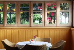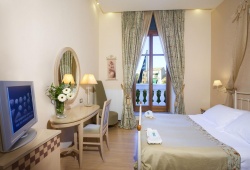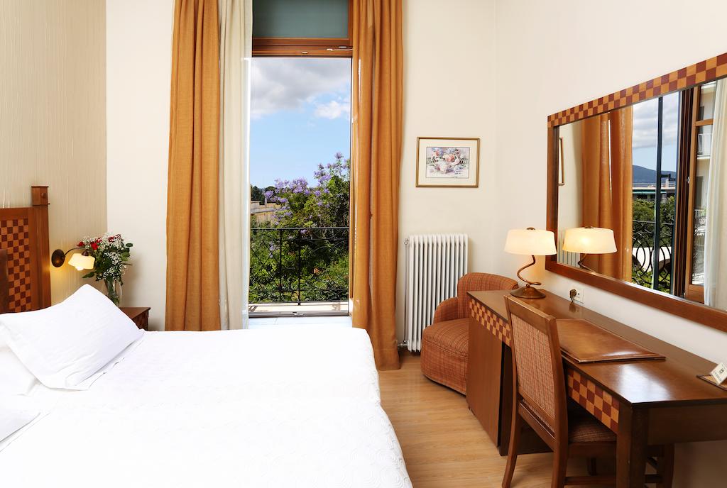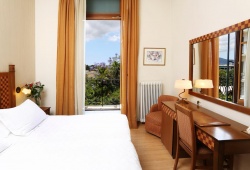 With 30 rooms and 1 suite, the Bella Venezia Hotel in Corfu Town offers amenities including private bathrooms, free internet and direct phone calls, air conditioning, a mini-fridge, a flat-screen TV, a safe, and state-of-the-art orthopaedic beds with double mattresses and fine linens and duvets. The accommodations include a big master bedroom on the second floor with a panoramic view of the town, perfect for families, and two exquisite suites created with honeymooners in mind. The hotel's public spaces retain the feel of an English club from the 19th century and include a fully equipped snack bar, tall ceilings with intricate carvings made of wood, floors with a checkered pattern of pink and white marble from Ioannina, and all of the mansion's original architectural features.