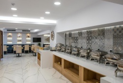 Together with snacks, delicious beverages, and fresh juices from the bar, guests may enjoy sunbathing all day at the swimming pool and bar. Enjoy a delicious continental breakfast upon awakening, served either on the sunny patio or in the hotel's restaurant area. You may savor the rich and delectable Dinner Buffet, which includes a range of options from European and local Greek cuisine, either indoors in the air-conditioned Restaurant or outside on the Terrace of the Pool Bar. Maintaining your fitness regimen is also possible at the Mini Gym, which offers views of the pool and sea.