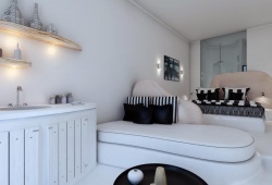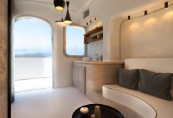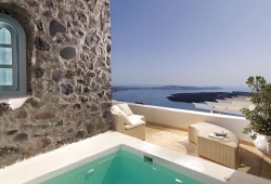 The whitewashed apartments and studios, all in the traditional Cycladic style, are built on different levels of the cliff, with terraces or balconies facing the superb surroundings. In their discreetly luxurious interiors, you’ll find comfort and relaxation. Some suites have an indoor jacuzzi but all have balconies with a seating area overlooking the famous Volcano and the Endless Blue Aegean Sea. Breakfast is served daily at the restaurant along with lunch and dinner. Relax yourself at the pool and bar for free time. Treat yourself duting your stay at Tholos hotel with massage treatments or even a hair cut in your room.