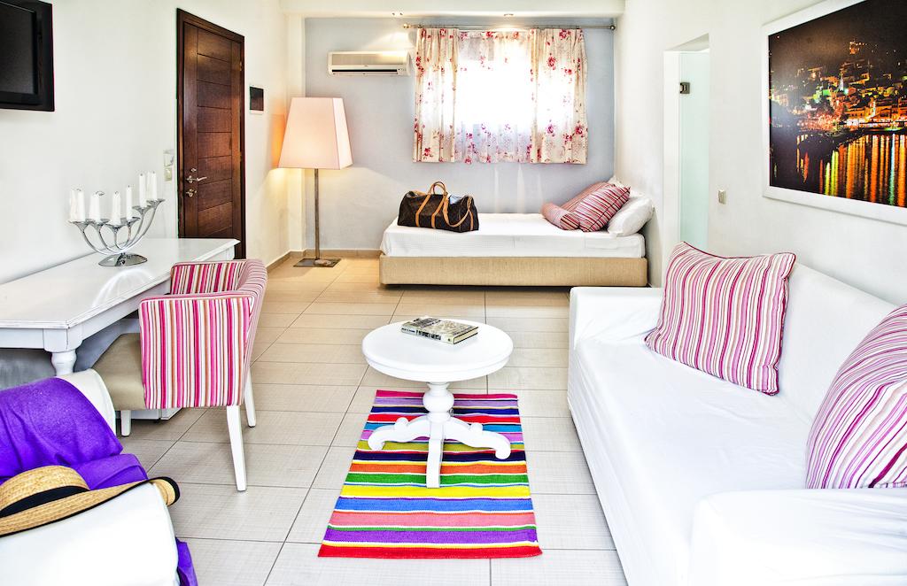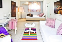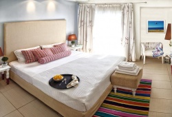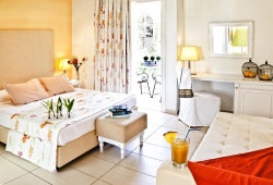 Situated in close proximity to the ecological park of Koukounaries, Mandraki Village is a luxury hotel in Skiathos offering excellent beach accommodation to families with children and anyone who is looking for the perfect blend of discreet luxury and comfort. Mandraki Village has been fully renovated and upgraded to one of the best luxury accommodations in Skiathos. The resort is made up of eight brightly colored houses with 38 well decorated rooms and suites situated on an acre of beautiful grounds. This makes for a relaxing ambiance perfect for family vacations near the beach.