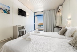 Located in the charming seaside town of Naoussa, Paros, Hotel Hippocampus is about 600 meters (less than ten minutes' walk) from the village's center square. This Paros hotel features 47 double rooms and 2 family rooms that sleep two to four people each with a private bathroom, hair dryer, phone, air conditioning, TV, mini-fridge, and safe deposit box. Every room at Hippocampus hotel has a separate balcony with a table and chairs and a beautiful view of the sea.