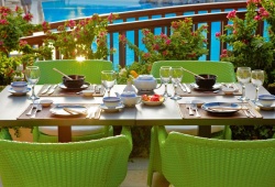 Greek, Mediterranean, and Asian cuisines are among the superb all-inclusive dining options provided by the hotel. The hotel's Cretan organic restaurant, Agreco, has been named the finest in the world for organic dining. A spa center with an indoor pool, sauna, steam room, and workout room equipped with cardio equipment is accessible on site, along with an extensive array of sport and water sport amenities. There are also several stores and boutiques, a round-the-clock medical facility, and a 24-hour welcome service on the premises. Grecotel Marine Palace & Aqua Park in Panormo is located 14 km apart from both Rethymno Town and Port. It is 60 km to Heraklion International Airport.