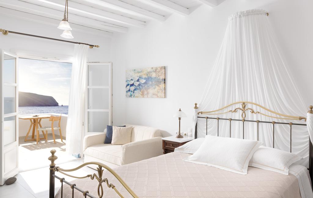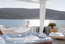 In the charming town of Pollonia on Mylos, the Melian boutique hotel offers some of the best luxury accommodations. It is perfectly located on the volcanic beach of Pelekouda with unhindered views of the lovely sea. This Mylos hotel embraces the traditional spirit and stunning architecture of the Cyclades and offers 15 tastefully designed sea-view suites. A sense of true aristocratic grandeur is conveyed by the exquisite handcrafted furniture and modern accents that contrast with the spotless white interiors of the specially designed rooms.