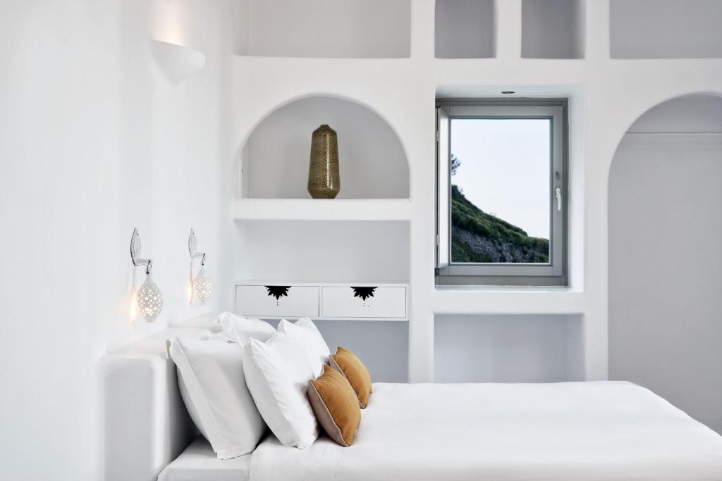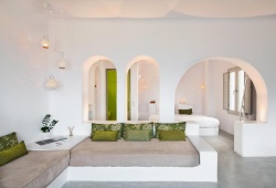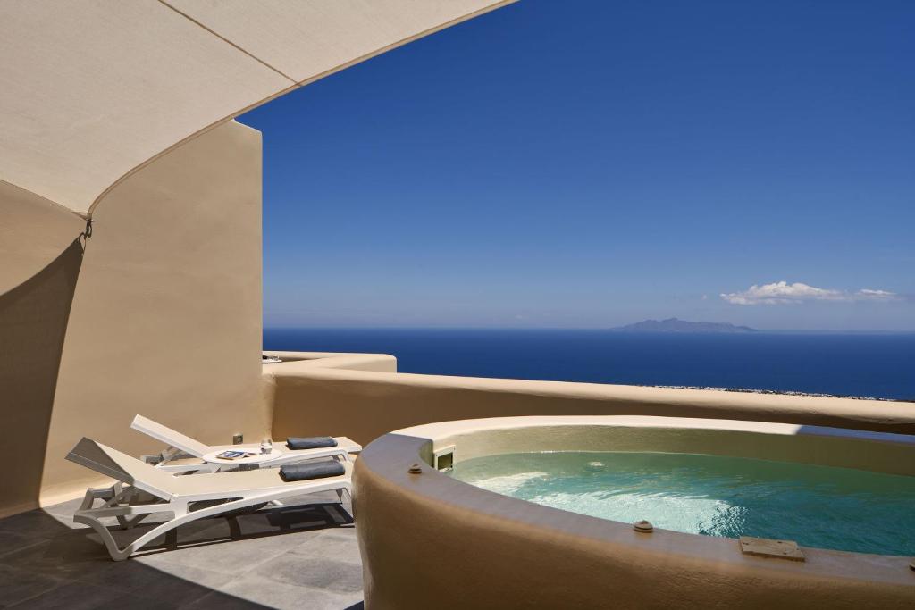 Situated 500 meters from Pyrgos village's main square in Santorini, just below the historic castle, is the Skyfall Suites, perched on a hillside overlooking the Aegean Sea. The Skyfall suites have clean, straightforward design with vibrant accents. Each one has a kitchenette with an eating space and air conditioning. A flat-screen TV with satellite service, complimentary toiletries, bathrobes, and slippers are among the amenities. A brand-new spa with a steam room, sauna, heated pool, and spa rooms has been added to Skyfall rooms' amenities. A variety of beauty treatments are available to enhance your visit.
